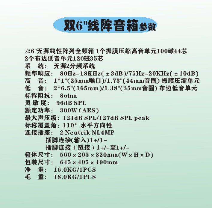 低音单元 | 2*6.5"(165mm)/1.38"(35mm音圈) 布边低音单元 | ||