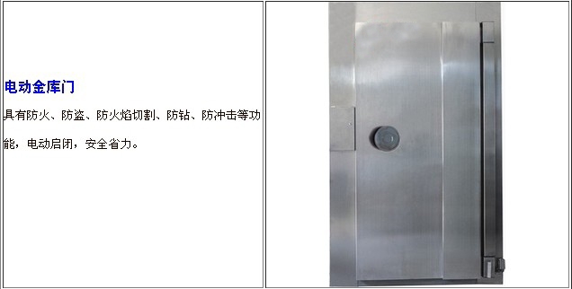 金库门选用优质超厚防爆钢板,特种防钻合金板和标准槽钢、进口不锈钢板、进口密码锁(可按用户需要选配高、中、低档锁具),及特种填充料等利用先进设备加工而成,足以能抵御、阻止目前 先进而强硬的攻击手段;并配置日闸门和备用小门,能确保库内财产的安全。