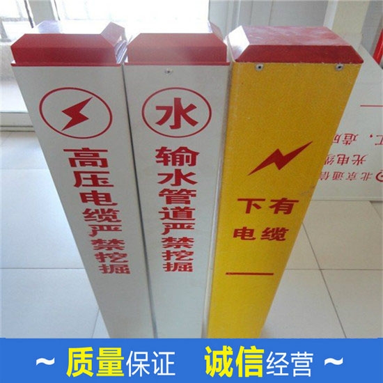 玻璃钢燃气管道标志牌 双柱式玻璃钢标志牌 双柱式玻璃钢标志牌 公路里程分界桩厂家 供水管道标志牌 玻璃钢标志牌 公路里程分界桩电力专用玻璃钢警示牌,中石油燃气管道户外标志牌,挤出玻璃钢工艺。由于受制于工艺要求,挤出玻璃钢表面不平,有气孔,所以对反光膜的粘接力不足。所以也不适宜做交通标志底板。 模压玻璃钢。模压玻璃钢是在高温高压下成型的,表面平,对反光膜的附着力满足要求。按交通部测试反光膜对标志底板附着性能的实验,实验5分钟后,反光膜的剥离长度为3-4mm,大大小于标准要求的20mm。 玻璃钢材料在大气中的老化主要是太阳辐射、高温、潮湿空气及风吹雨打的机械作用,致使玻璃钢表面树脂脱落,露出白丝,失重,同时紫外光照射使活性物质降解、氧化,使玻璃钢颜色黄变。针对以上现象,必须加入防老化剂、抗紫外光剂,延缓其老化过程。标牌是在户外使用,下雨时,不同树脂的耐水性能差别很大,邻型不饱和树脂要好于乙烯不饱和树脂的耐水性。所以选好合适树脂用于标牌上很重要