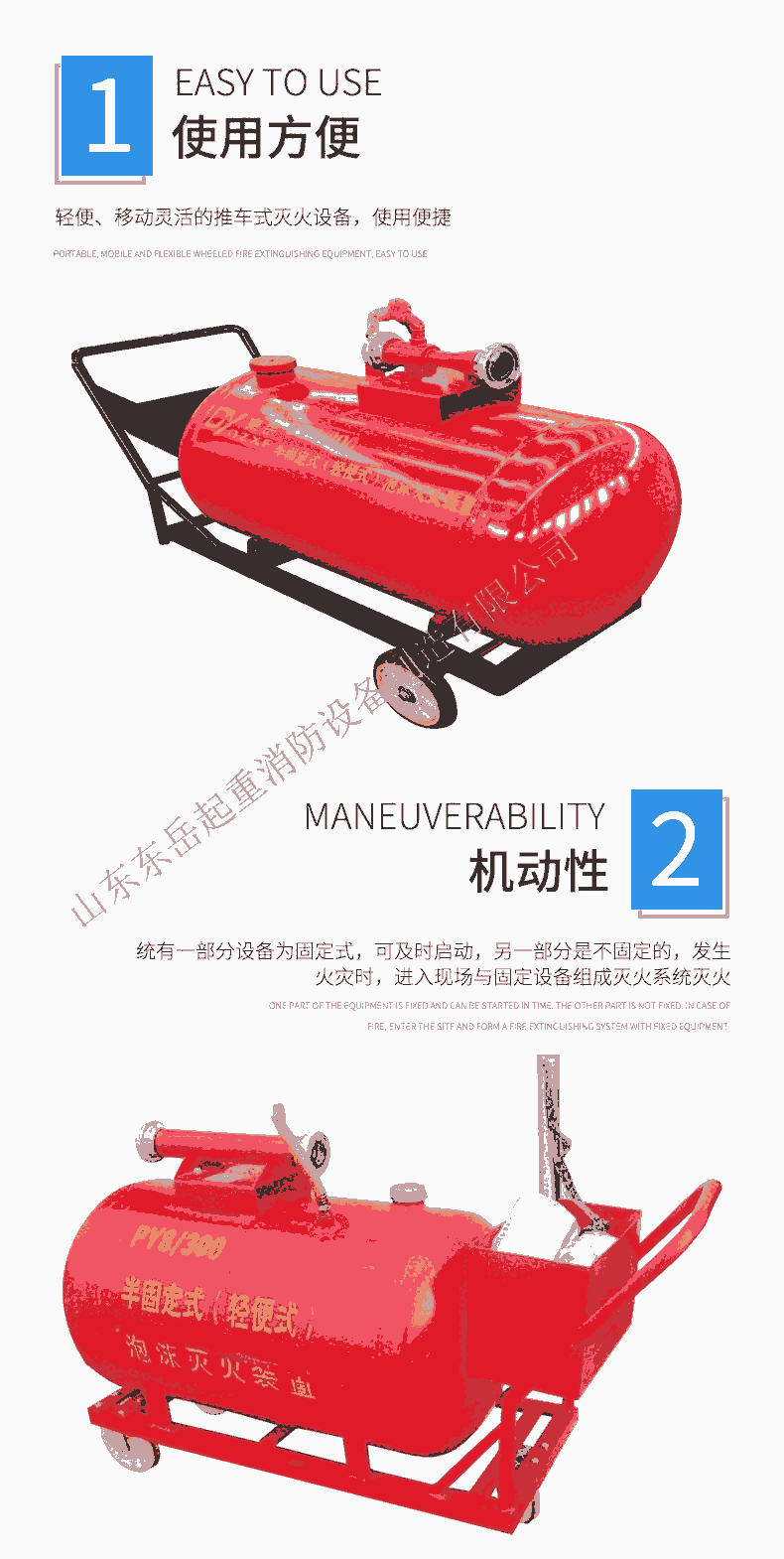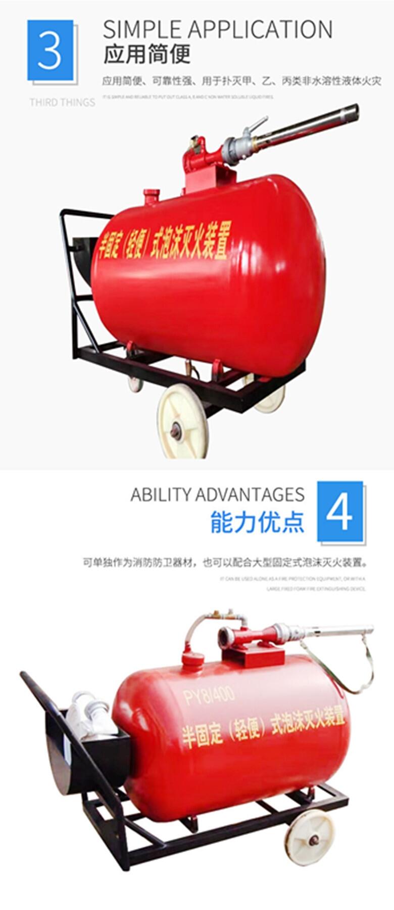 移动式泡沫车、PY移动(车)式泡沫灭火装置是一种轻便移动灵活的推车式灭火设备。它采用PHF型管线(负压)式比例混合器,可与泡沫产生器组成低、中、高倍数泡沫灭火系统。当压力水经过混合器时,水跟泡沫液按一定比例混合,经泡沫产生器喷射泡沫扑灭火灾。由推车、常压泡沫罐、负压比例混合器、喷射设备、水龙带、安全阀、控制阀门及一些辅助零部件等组成。