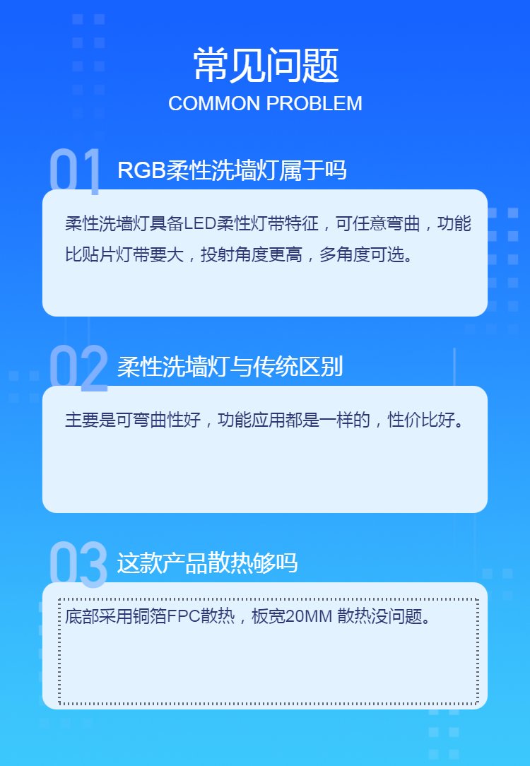 寄语:本产品是一款LED 低压柔性洗墙灯,采用了SMD5050 LED作为光源。LED排布距离42PCS/M, 6个灯形成一个回路、每隔120mm可任意剪断 ,每一组都可以单独正常点亮实用;LED显指Ra大于90;2835属于贴片型光源,尺寸为5.0MM*5.0MM的方形,故为5050型号;FPC板采用50铜双面板作为基板,具有良好的导电性能,表面采用环保覆膜材料,不漏电,保证安全;底部采用导热双面胶材质,具有导热性、粘性强等特点。