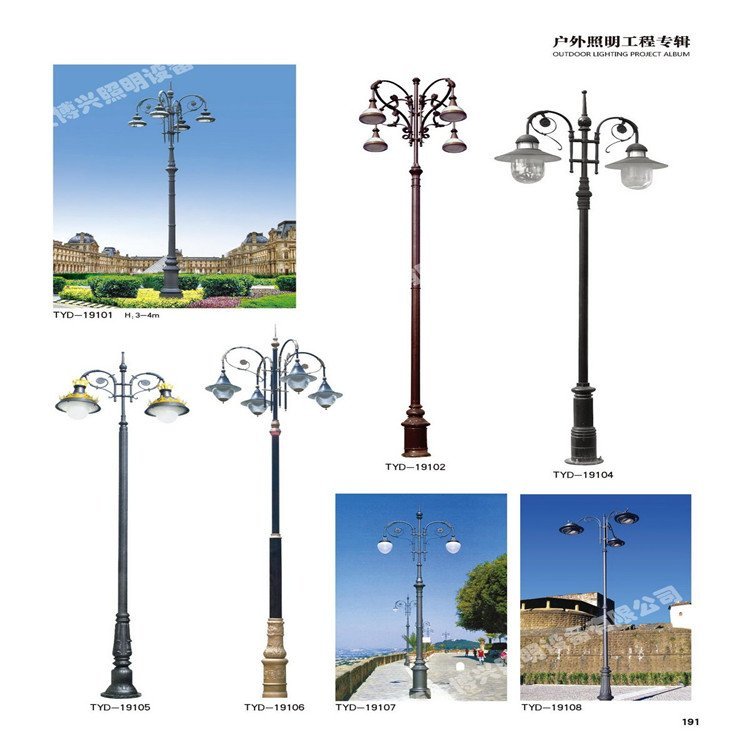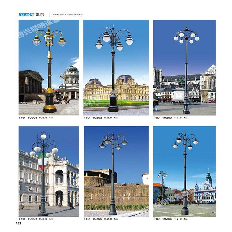 ? ? 庭院灯杆体有浇铸铝、普通钢材、不锈钢材,其中前两种原料防腐性能好、造型改变多,如铝浇铸灯杆、支架及灯碗,不但造型多样,并且外表可雕有各种花纹,艺术性较高;不锈钢原料天生亮丽,色泽天然,配以一定造型给人以轻盈纯真之美感;地埋灯则以铝质、不锈钢为主;草坪灯则以浇铸铝、钢质居多。紧固体均采用不锈钢件,方便维修。灯罩原料选用防弹玻璃和有机材料(PL、Pc、PMMA等),其性状有通明与不通明、无色与有色之分,依据不同的灯型,挑选恰当色泽的透光罩,能起到画龙点睛的作用。彩色有鲜活动听之感,不通明有模糊妩媚之感,通明则有晶亮透亮之感。