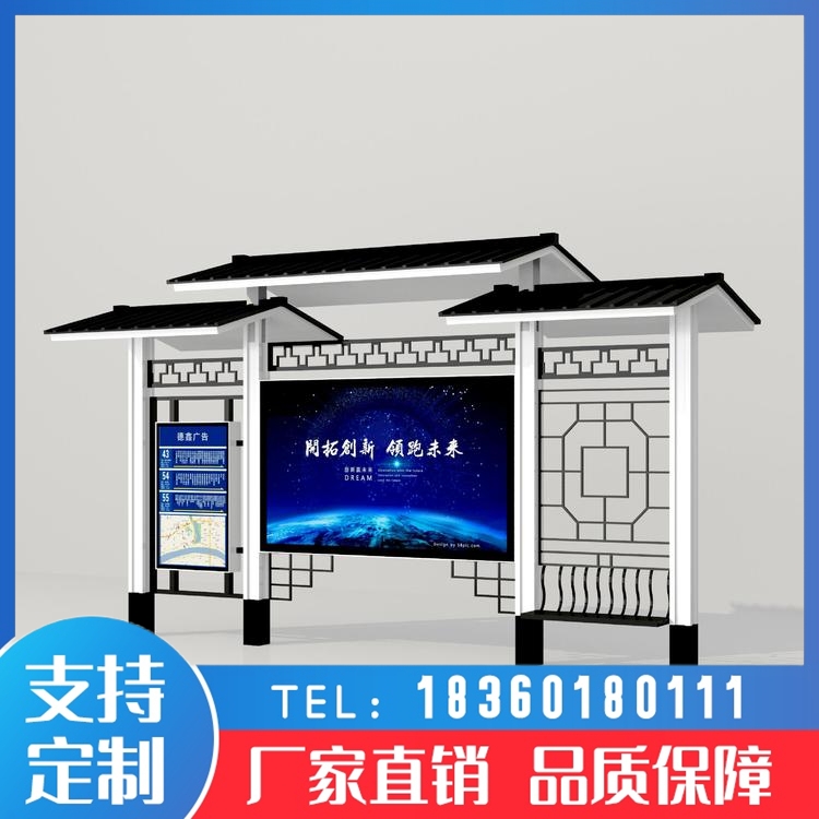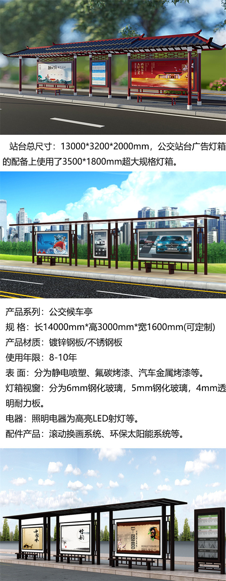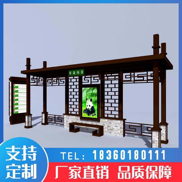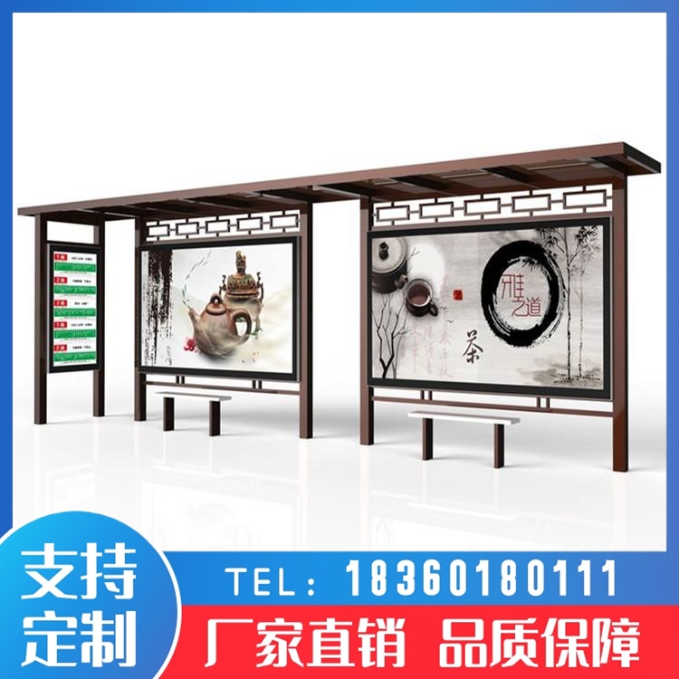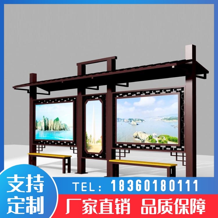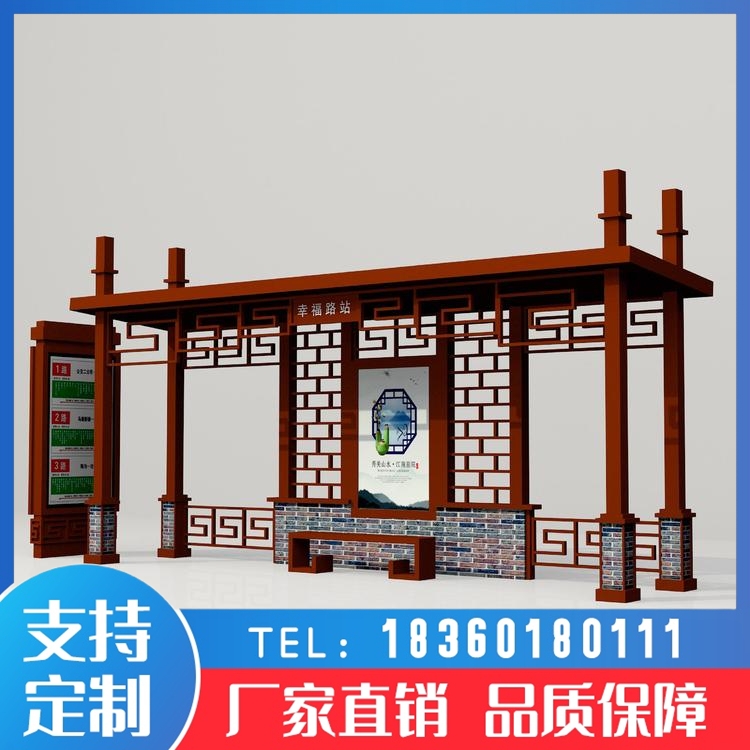 公交站台仿古候车亭厂家复古瓦顶棚木纹漆立柱恒宇定制