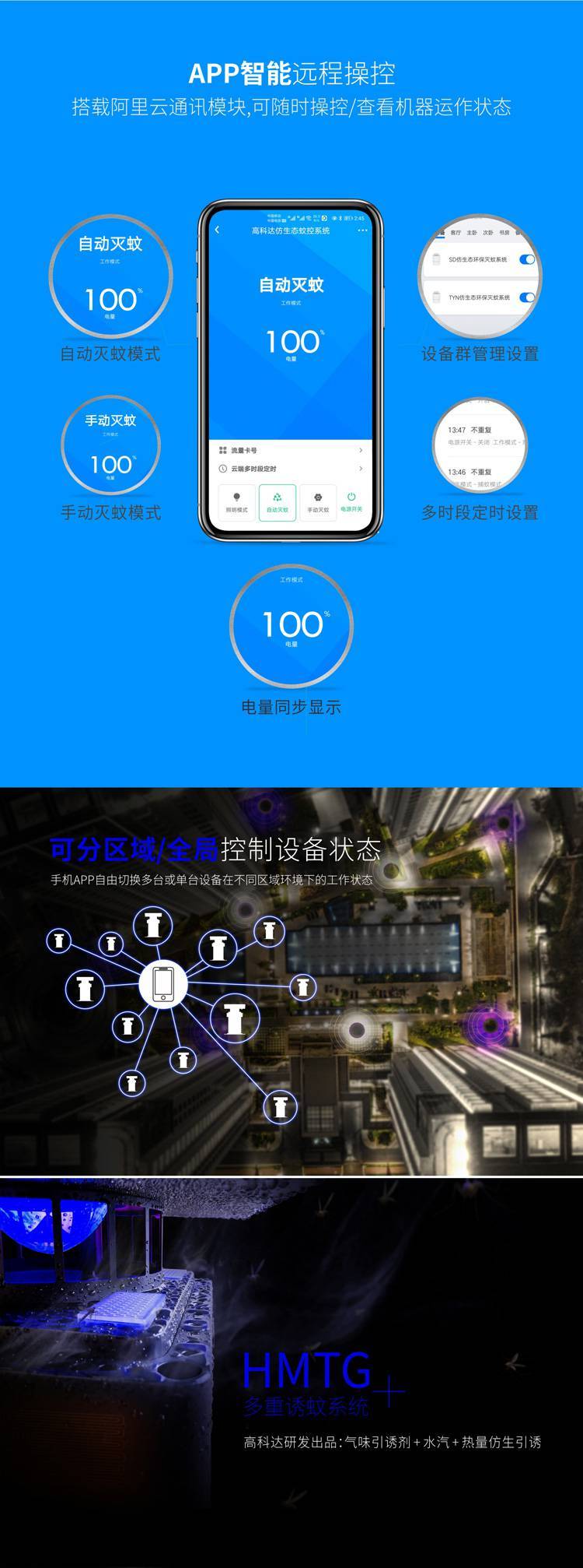 2、灭蚊系统搭载阿里云通讯模块,APP智能远程控制,可随时查看/操控机器运作状态。