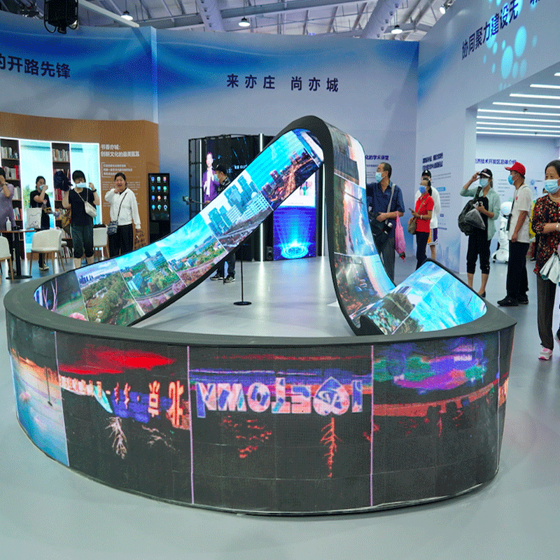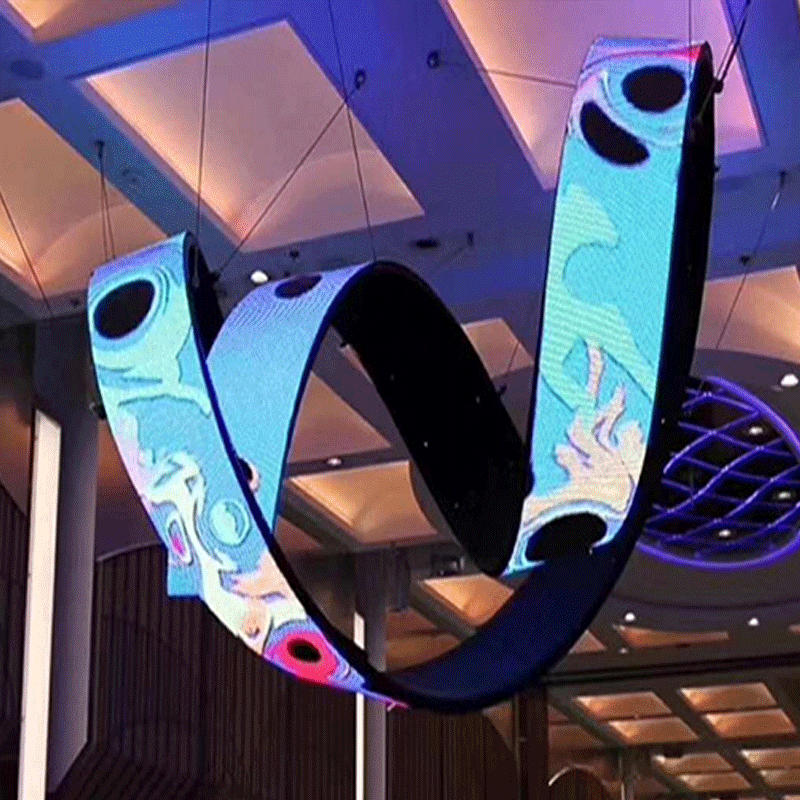LED莫比乌斯环由多个弯曲的LED模块组成,形成一个闭环或半闭环的结构。LED模块在设计上具有特殊的形状和连接方式,使得它们可以沿着环形路径进行连接,形成连续的显示屏表面。通过控制系统对LED模块进行统一的控制,可以实现显示内容在莫比乌斯环上的平滑过渡和连续显示。