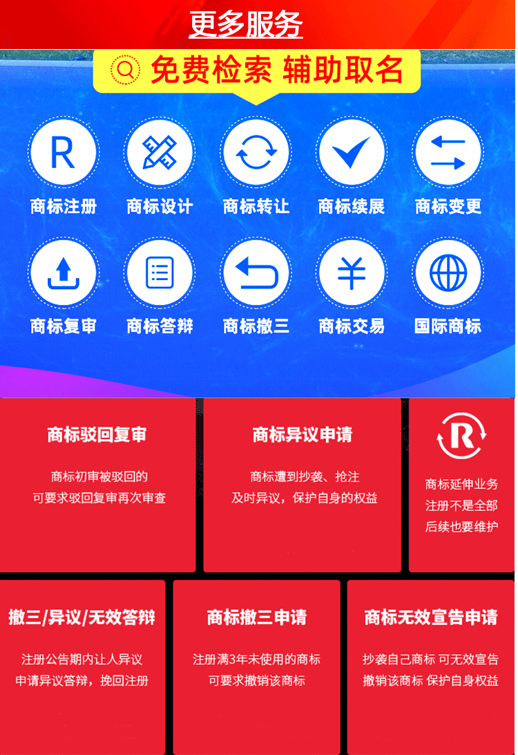 更多服务 | 商标注册转让 商标续展 商标驳回复审 异议/答辩 宽展 变更 | ||
