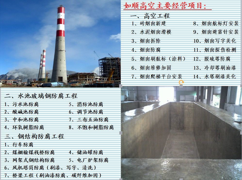 3、三布五油玻璃钢防腐施工工艺适用范围 要求防强酸﹑强碱化学溶剂腐蚀的混泥土处理池、地面及墙面;各种钢制容器;各种金属类设备基础表面等的防腐施工