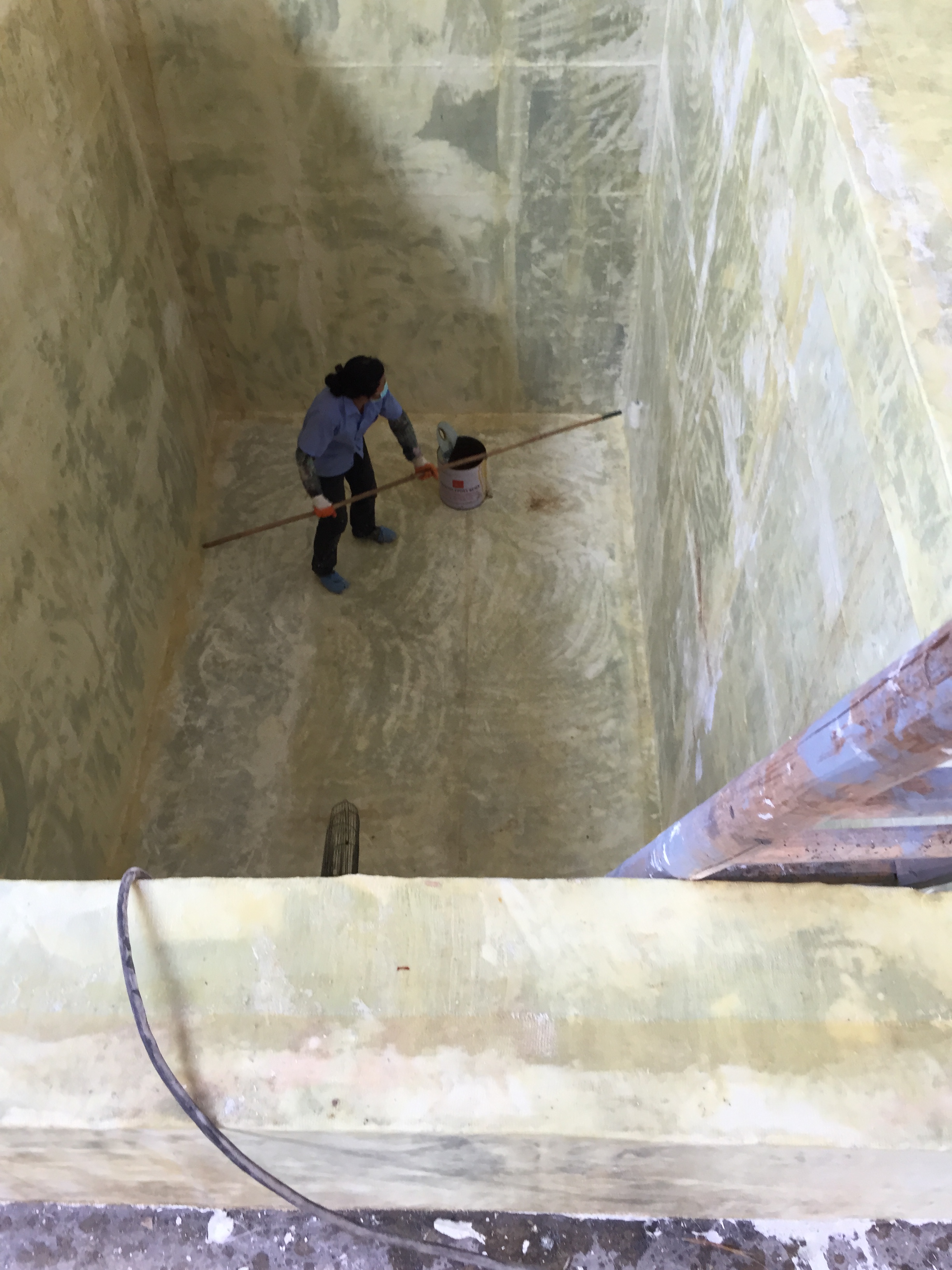 这是常见的防腐蚀处理方法,它是利用玻璃纤维增强塑料(俗称“玻璃钢”)结构在混凝土基础上形成一层防护,玻璃钢衬里具有整体性、抗渗性好和造价合理的特点,同时选用适当的防腐蚀树脂就能够达到良好的防腐蚀效果。在玻璃钢衬里防腐蚀工法中,一般采用玻璃纤维加玻璃纤维短切毡或表面毡的复合结构,厚度在1-3mm之间。