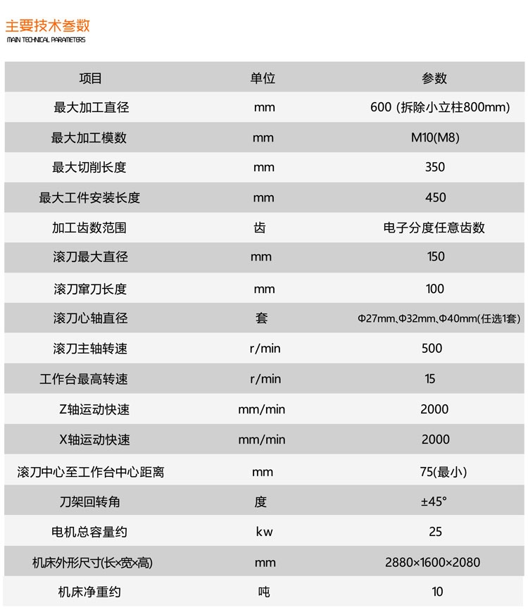 ??该型号的数控高效滚齿机,采用广州数控218M系统。各数控轴均为独立驱动,以电子链按展成原理完成圆柱直齿轮、斜齿轮、蜗轮、同步带轮等齿轮的加工。