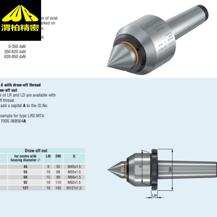 顶尖承受的弹性压力分别以黄、绿、红三种颜色的色环来标识,具有非常大的弹性范围。应用于端面驱动顶尖的配套尾座顶尖。代表不同压力标识的色环可以使我们快速的调节和检测尾座的压力。此类顶尖的 选择要根据工件的形式和稳定性来决定。