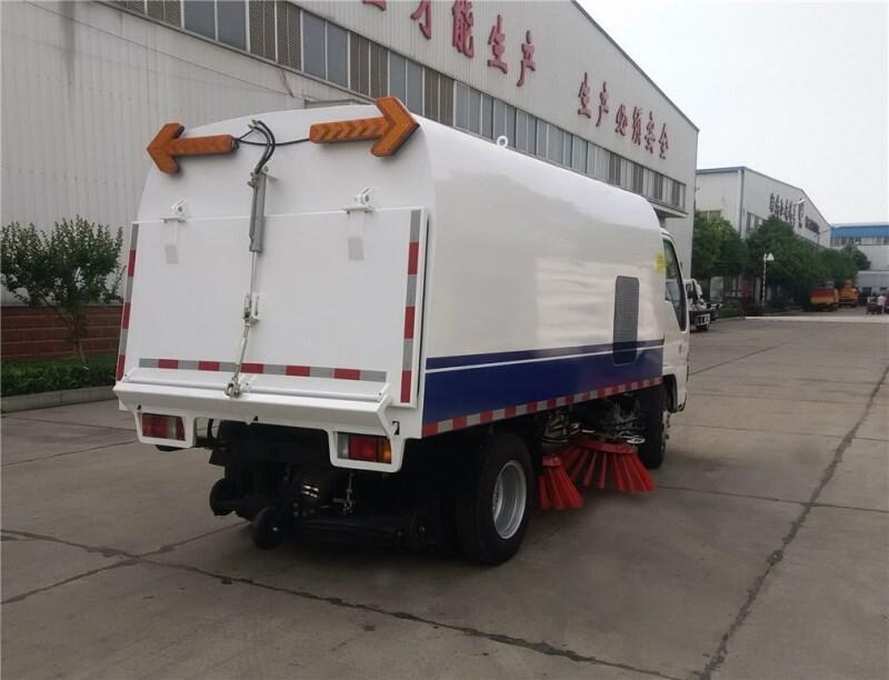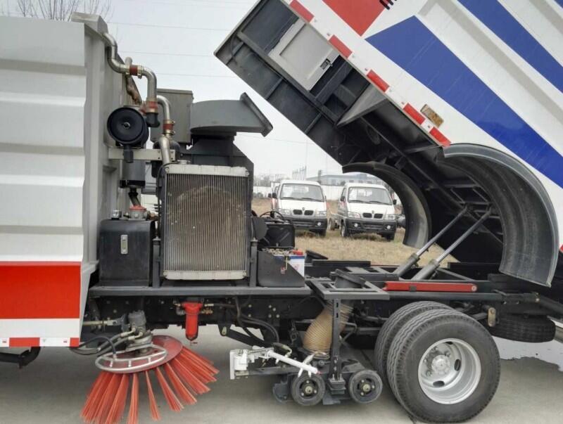 上装标配:带4个扫盘、江铃副发动机、三洋马达、施耐德控制开关、海普瑞斯电磁阀组、无级变速自动离合器、免维护离心式自动风机、不锈钢垃圾箱、尾部LED箭头指示灯、手动泵应急系统、中联北极星电子水泵,垃圾举升自卸功能。