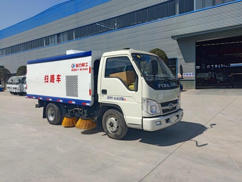 程力公司生产的扫地车解放扫地车、江淮扫地车、庆铃扫地车、东风多利卡扫地车、福瑞卡扫地车、东风145/153扫地车、天锦扫地车等等!程力扫路车采用中置四扫刷、吸口后置的布置方式,使得整车结构布置简捷、清扫效果良好。该车的垃圾箱及水箱为全部采用超厚不锈钢材料制作;垃圾箱与水箱为整体结构,水箱在垃圾箱的底层使垃圾箱底板预倾角高达12°以上,便于垃圾倾倒干净。垃圾箱顶部设置了导流槽及较大面积过滤网,能够充分提高降尘效果,使的垃圾堆积均匀,增加有效容量,减少因轻浮物堵塞滤网而产生的空气阻力。