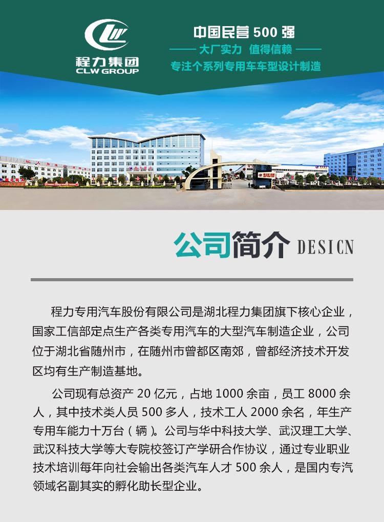 程力专用汽车股份有限公司(以下简称公司)是程力汽车集团旗下核心企业,定点生产各类专用汽车的大型汽车制造企业,公司位于湖北省随州市,在随州市曾都区南郊,曾都经济技术开发区均有生产制造基地。