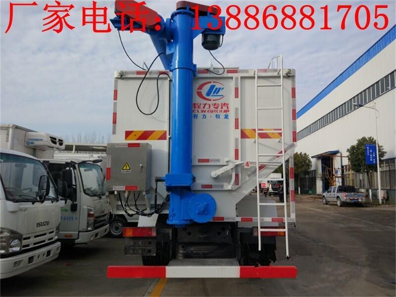 上装配置: 罐体可根据用户要求做多个独立分仓,可以独立控制各分仓卸料顺序和速度。罐体材质采用4mm优质碳钢板,整车3条绞龙,有3个5.5KW电机(万邦 西门子)带动,顶部绞龙液压控制举升,可左右旋转180°,罐体可根据用户要求做多个独立分仓,可独立控制各分仓卸料顺序和速度,卸料管倾斜60度,垂直卸料高度8.5米,整车卸料完用时20分钟。