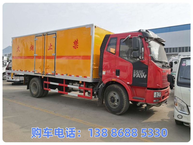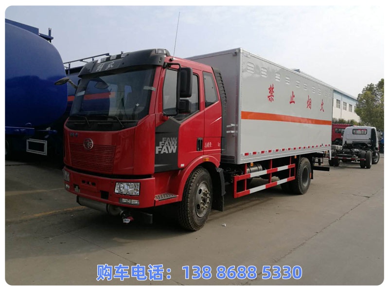 1.该车为危险货物运输车辆,主要用于运输独立容器(瓶)包装的易燃液体;危险货物类项号:3;厢体顶部封闭,不可开启.2.侧防护材料为Q235B,与车架焊接连接;后防护材料为Q235B,与车架焊接加螺栓连接,后防护装置结构为圆柱体,直径120mm,后防护装置离地高450mm;起重尾板收起状态的水平长度为300mm,尾板质量为450kg.3.仅采用3900mm轴距底盘,仅采用245/70R19.5 16PR轮胎,整车长度/前悬/后悬对于关系为(mm):7300/1155/2245,7200/1155/2145,7100/1155/2045,7000/1155/1945;安装限速装置,限速80km/h;仅采用排气管前置,子午线轮胎的底盘;转向轮安装轮胎爆胎应急防护装置,该车安装带有卫星定位功能的行驶记录仪;可选装直接供电ETC车载装置.ABS生产厂家/型号:1.广州瑞立科密汽车电子股份有限公司/CM4XL-4S/4M;2.浙江万安科技股份有限公司/VIE ABS-II;;发动机对应油耗值分别为(L/100km):WP3NQ160E61/20.85,CA4DD2-18E6/21.25.4;选装不带起重尾板(不带起重尾板时:后防护材料为Q235B,与车架焊接加螺栓连接,截面尺寸120×60mm,后防护装置离地高度450mm);5.随底盘选装驾驶室,随底盘选装油箱、尿素箱、电瓶安装位置选装不同的油箱安装位置.