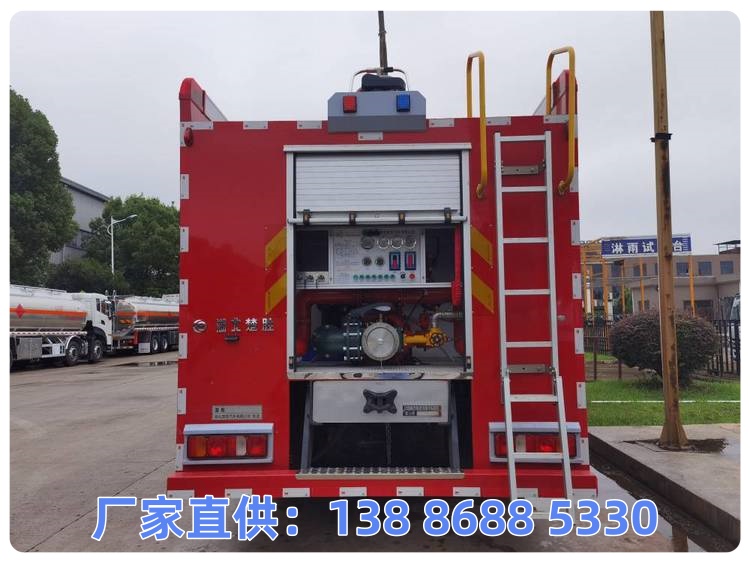 选装后部带拉梯架装置及随底盘部件布局选装不同侧面样式。水罐容积为15.800立方米,水罐尺寸:4420×2450×1530mm。整体式侧防护结构,后防护装置材料:Q235A,截面尺寸:120×120mm,与车辆连接方式:螺栓连接,后防护离地高度:435mm,ABS生产企业为威伯科(上海)管理有限公司,型号为4460046300。主要专用装置有消防泵、消防炮。
