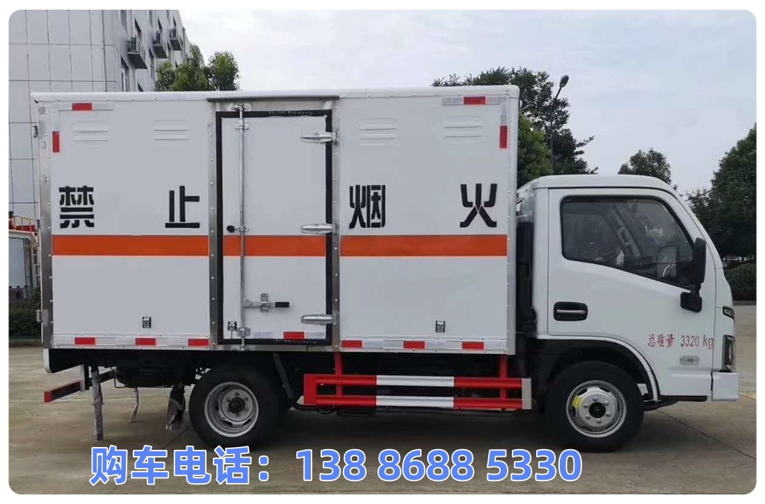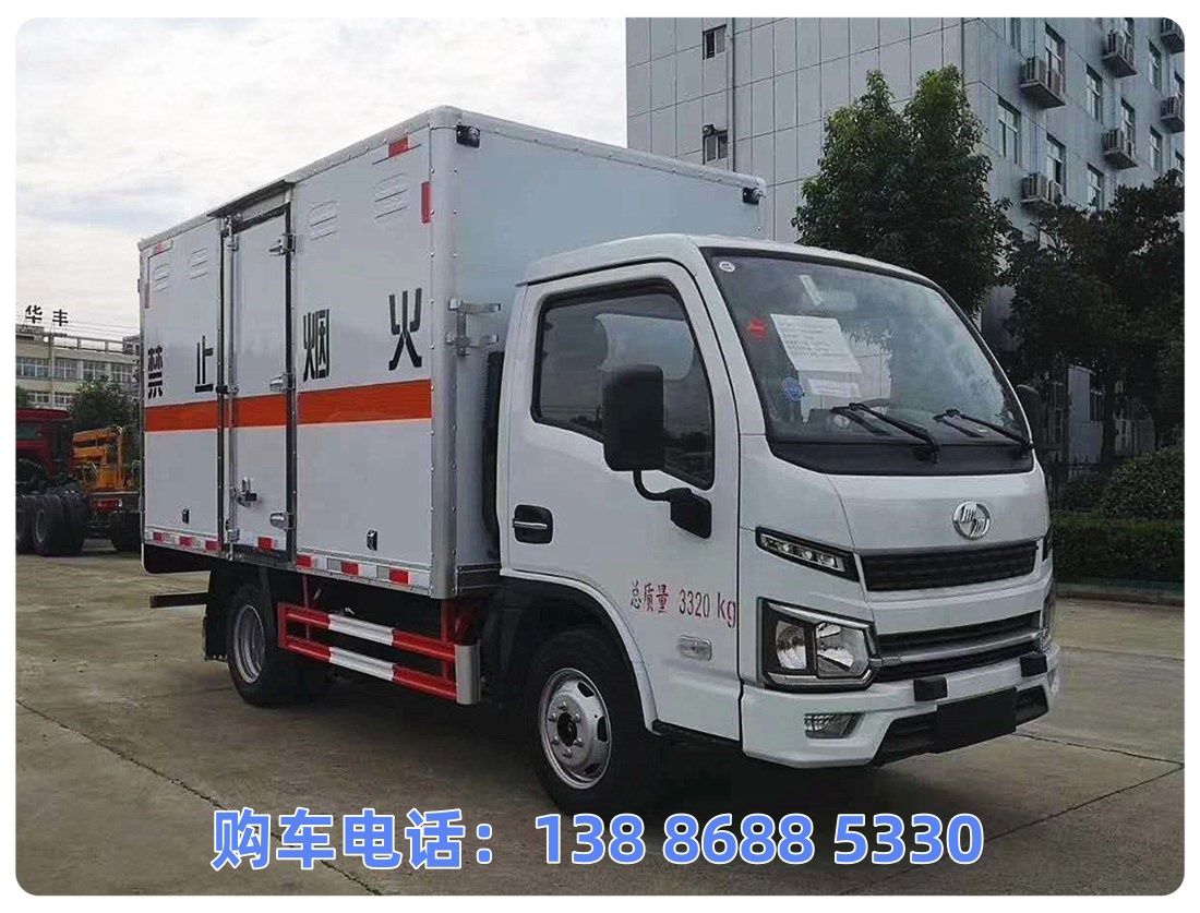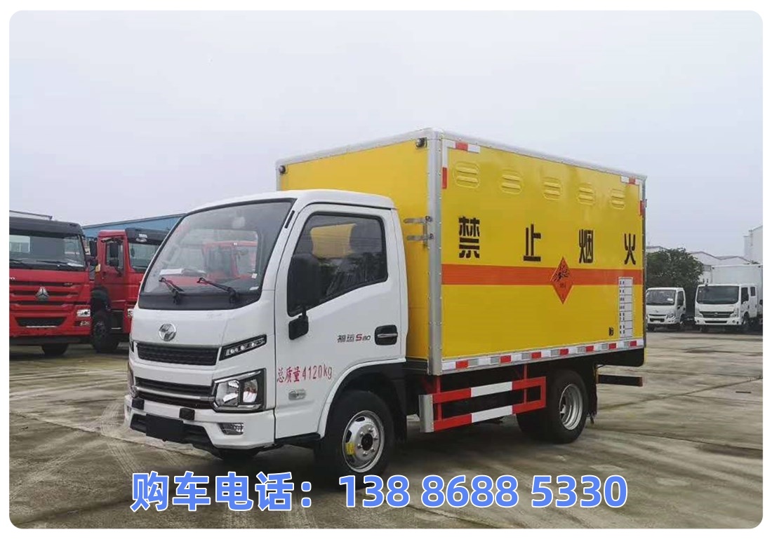 该车适用于运输危险品,随底盘选装驾驶室及轮辋,危险货物运输车辆的类型(EX/Ⅲ),厢体顶部封闭,不可开启,运送爆炸品的品名:,运送危险品的项号:1.1D,1.1D,1.1B,1.1D;安全装置为导静电带,用于防止静电;仅采用底盘子午线轮胎和带ABS的底盘,该车前轮安装盘式制动器,前置排气管,装配限速装置,限速80km/h;安装带有卫星定位功能的行驶记录仪;防护材料:Q235A碳钢,连接方式:左右侧面及后下部防护均采用焊接连接,后防护截面尺寸(mm):100×50,离地高度为370mm。整车长度/轴距/后悬对应关系为(mm):5200/3100/1010,5200/2850/1260,4900/2850/960,4780/2650/1040.5200/2650/1460.采用发动机Q23-95E60对应的油耗值(L/100km)为:11.4。ABS控制器型号/生产厂家:YF8/武汉元丰汽车电控系统有限公司。转向轮装备轮胎爆胎应急防护装置。该车可选装ETC车载装置。整备质量对应的配件配备:润滑济,燃油箱(90%容量)等。