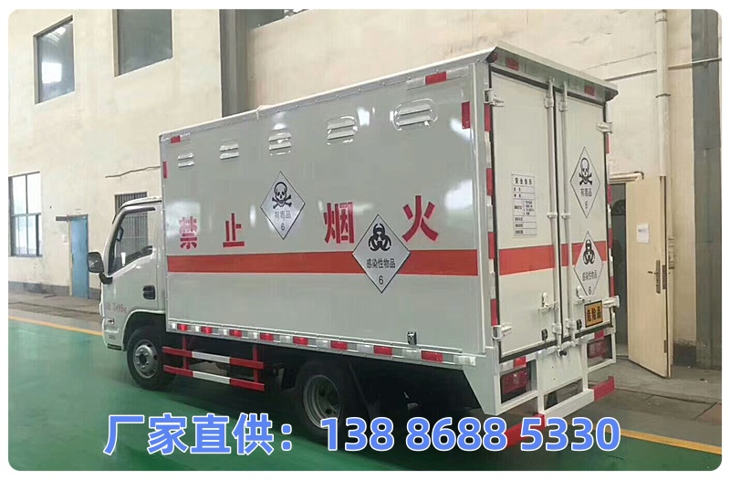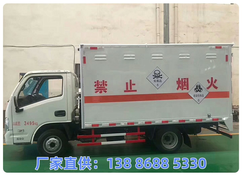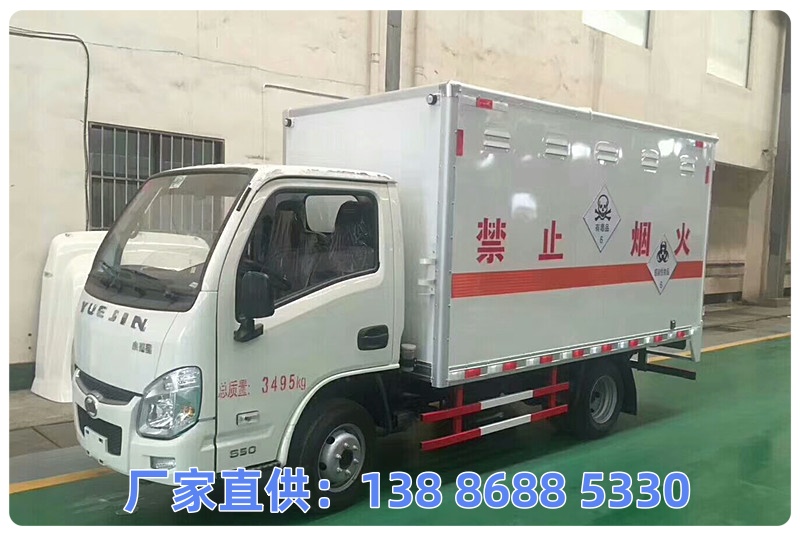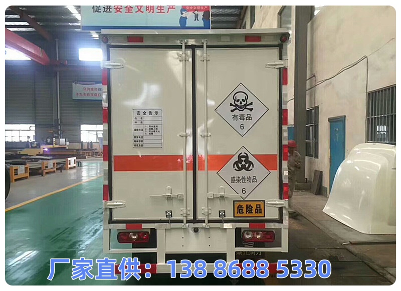 该车适用于运输危险品为危险品运输车。厢体顶部封闭,不可开启。随底盘选装驾驶室及轮辋。仅采用底盘子午线轮胎和带ABS的底盘,该车前轮安装盘式制动器,前置排气管,装配限速装置,限速80km/h。安装带有卫星定位功能的行驶记录仪。安全装置为导静电带,用于防止静电。整车长度/轴距/后悬对应关系为(mm):5200/3100/1010,5200/2850/1260,4900/2850/960,4780/2650/1040.5200/2650/1460.该车主要用于运输具有独立容器(瓶)包装的介质,类项号:8。侧防护和后防护装置材料材质为Q235A碳钢,侧防护与箱体副梁焊接连接,后防护装置与车架采用焊接连接。后防护截面尺寸(mm):100×50,离地高度为370mm。采用发动机Q23-95E60对应的油耗值(L/100km)为:11.4。ABS控制器型号/生产厂家:YF8/武汉元丰汽车电控系统有限公司。转向轮装备轮胎爆胎应急防护装置。该车选装ETC车载装置。驾驶室安装双预警装置。整备质量对应的配件配备:润滑济,燃油箱(90%容量)等。选装侧开门结构及外形样式。选装侧开门结构及外形样式。车厢质量根据不同尺寸约为860kg。厢体材质:内板为铝板(厚度1mm),外板为碳钢Q235(厚度1.2mm),夹层聚氨酯阻燃泡沫(厚度40mm),货厢底板为槽钢骨架厚度为100mm。