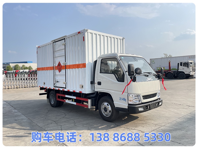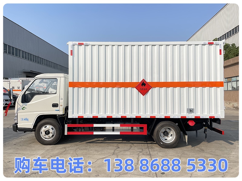 1、该车为危险品运输车.运输具有独立容器(瓶)包装的易燃液体物品.运送危险物品类项号:3类.厢体顶部封闭不可开启.2、侧,后防护材料均为Q235,侧防护螺栓连接,后防护焊接,截面尺寸(mm):100×50,下边缘离地高430mm.3、整备质量含备胎,灭火器及随车工具;货厢重量为1090kg;材质/厚度:复合板结构厢体:底板材质为Q235,厚度3mm,侧板为外Q235+中间阻燃泡沫+内纯铝板,厚度42mm;瓦楞板结构厢体:底板材质为Q235,厚度3mm,侧板为Q235,厚度1.5mm.4、仅选用排气管前置、限速装置(限速80km/h).子午线轮胎的底盘,转向轮安装轮胎爆胎应急防护装置,安装具有卫星定位功能的行驶记录仪.ABS系统控制器型号/生产企业: APG3550500A/浙江亚太机电股份有限公司,3550B500/浙江亚太机电股份有限公司,VIE ABS-II/浙江万安科技股份有限公司.发动机/油耗值(L/100km)对应关系为:JX493ZLQ6D/10.75,JX4D25A6H/10.83.随底盘选装驾驶室,选装白色中网,选装白色前保,选装黑色前保,选装厢体侧面选装开门型式及位置,选装不带侧开门,选装货厢平面或瓦楞结构;厢体侧面选装开百叶窗,选装后部样式,该车可选装直接供电式ETC车载装置.