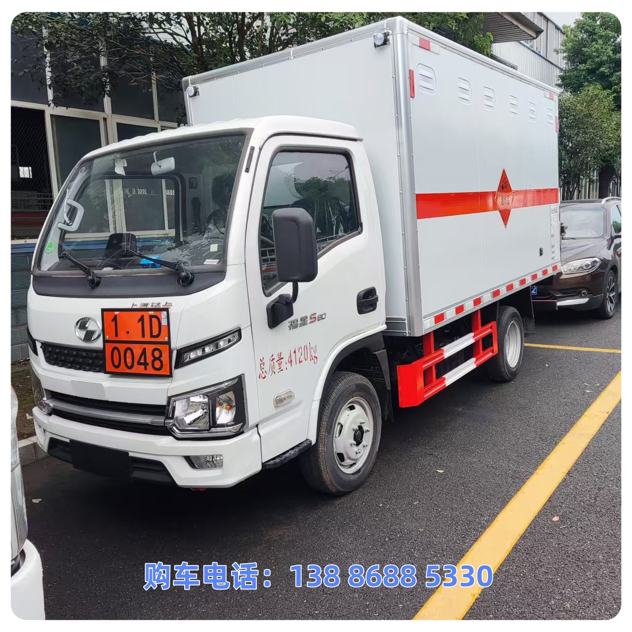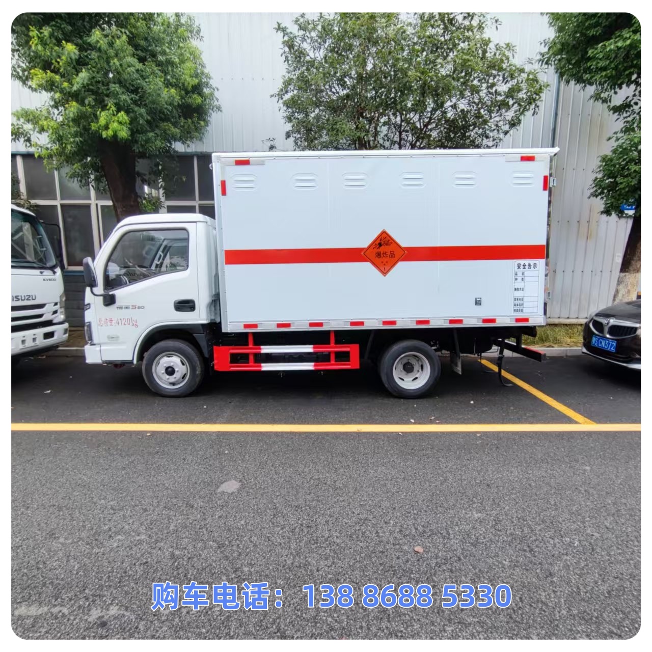 该车主要用于运输独立容器(瓶)包装的货物;EX/II型车辆;危险货物类项号:1.1B,1.1C,1.1 D,1.1G,1.2C,1.3C,1.4D,1.4G;厢体顶部封闭,不可开启;车厢侧板材质为铝板+阻燃材料+冷板,厚度为50mm,车厢底板材质为边框+花纹板+横梁+防静电胶皮,厚度为100mm;整备质量(kg)/货箱质量(包含挡泥板与防护)(kg)为:2465/980;侧、后防护材质均为Q235,侧防护连接方式为焊接加螺栓连接,后防护连接方式为螺栓连接;后防护断面尺寸(mm):直径100,离地高度:380mm;ABS控制器型号/生产厂家:YF8/武汉元丰汽车电控系统有限公司;仅采用的发动机型号对应的油耗申报值(L/100km)为:Q23A-95E60/11.11;仅采用子午线轮胎,排气管前置,安装限速装置(限速80km/h);安装具有卫星定位的行驶记录仪,转向轮装备轮胎爆胎应急防护装置,选装直接供电式ETC车载装置;该车整备质量包含灭火器,随车工具,不包含备胎;尾板收起状态的水平长度为260mm,尾板总质量为350kg.