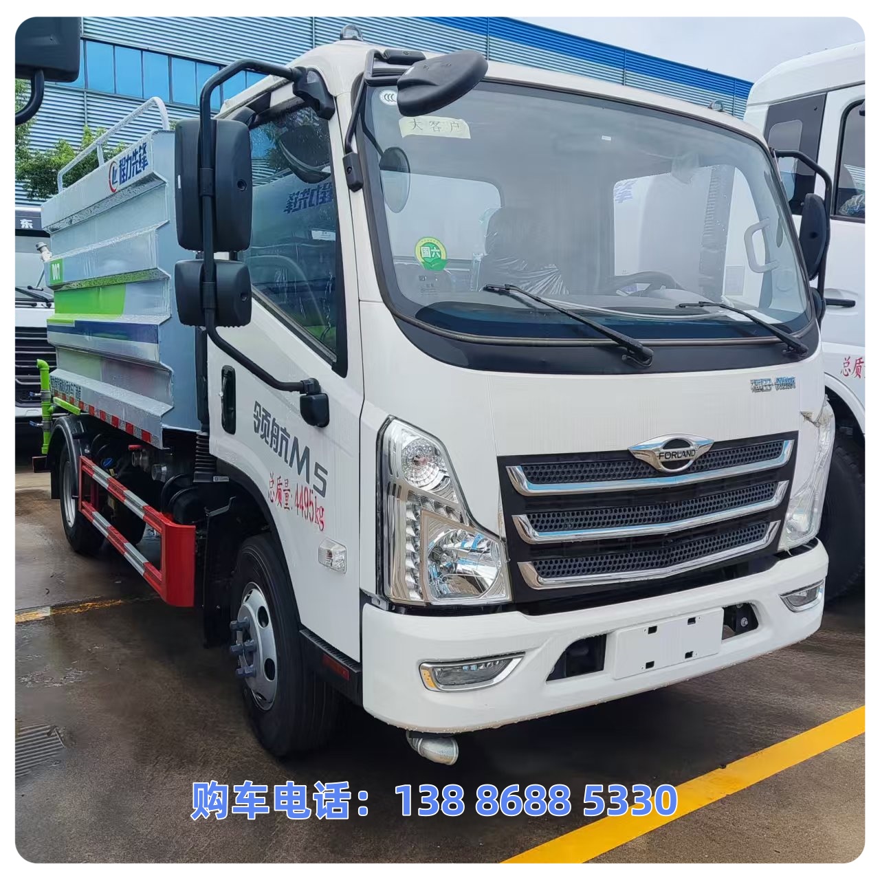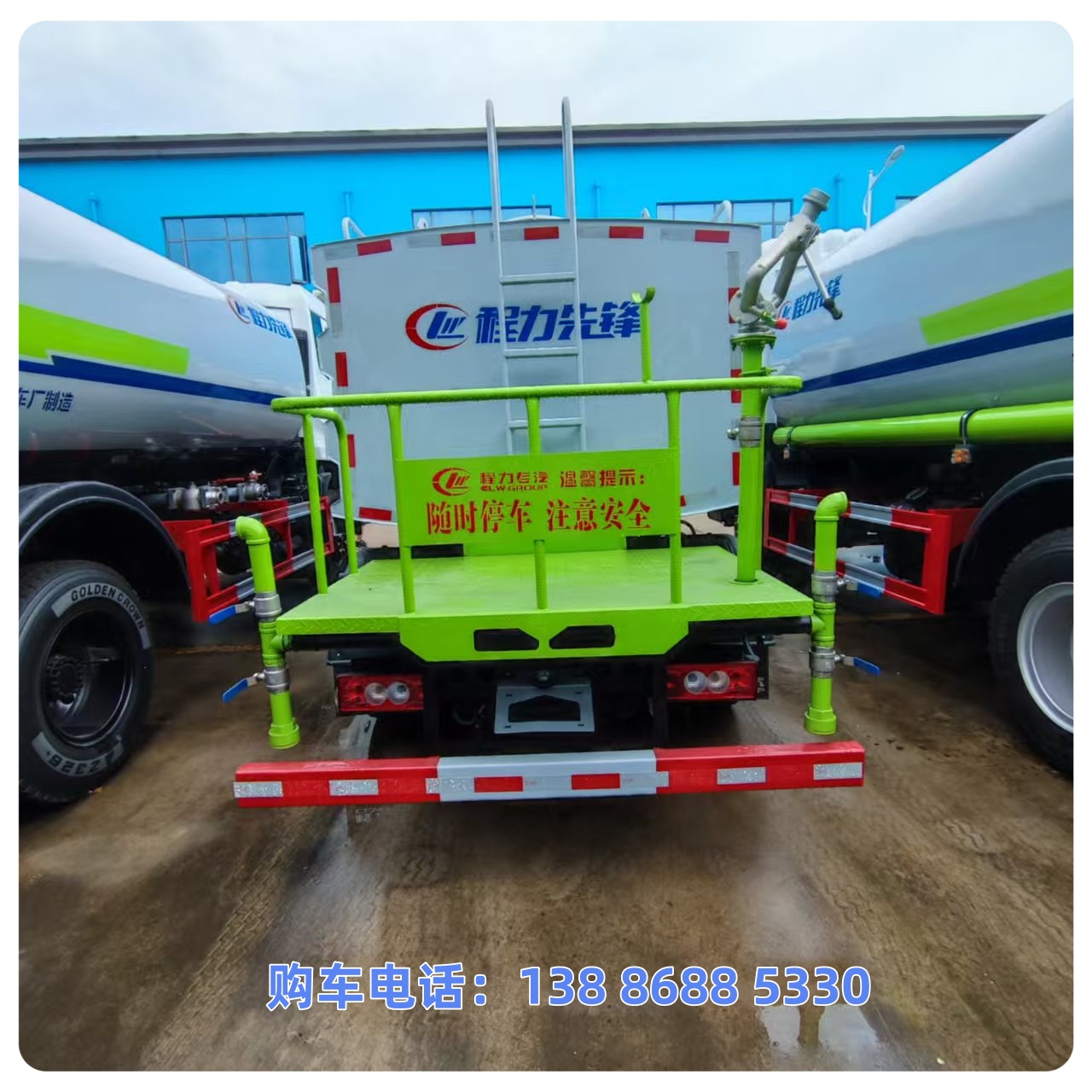 该车主要用于城乡园林绿化喷洒作业;主要装置为水罐及喷洒装置;罐体总容量:11.66立方米;罐体有效容积:11.1立方米;罐体外形尺寸(长×长轴×短轴)(mm):4200×2300×1450,4000×2300×1540.运输介质:水,密度1000千克/立方米;ABS型号为CM4XL-4S/4M,生产厂家为广州瑞立科密汽车电子股份有限公司.侧、后防护材料均为:Q235碳钢,连接方式均为:螺栓连接;后部防护截面尺寸(mm):120×50,后部防护离地高度(mm):480.随底盘选装限速装置,限速88km/h.选装前部电子水炮装置样式,选装前部不带电子水炮;当前部带电子水炮时,前伸500mm,整车长度为8250mm,8000mm;当前部不带电子水炮时,前伸为0mm,整车长度为7750mm,7500mm.仅采用底盘3950mm轴距改装.随底盘选装新款前格栅,新款保险杠,新造型前雾灯.选装油箱电瓶安装位置,选装车辆前部鸭嘴装置.选装喷洒装置样式,选装罐体顶部高位花洒装置,选装大工作平台,选装车辆前部鸭嘴装置,选装自动球阀安装位置,选装箭头灯装置,选装罐体顶部方形罐口及罐口位置,选装尾部自流口装置.后部作业灯仅在作业时开启,车辆行驶过程中不可开启.