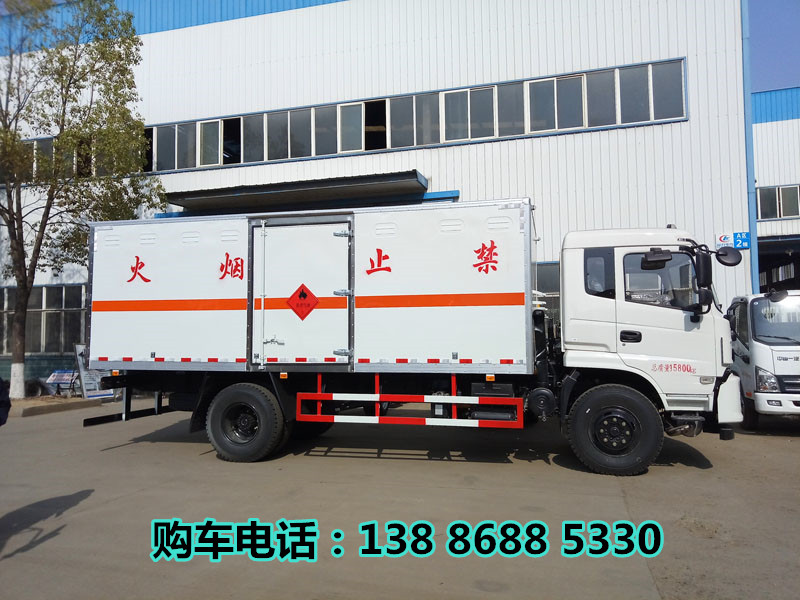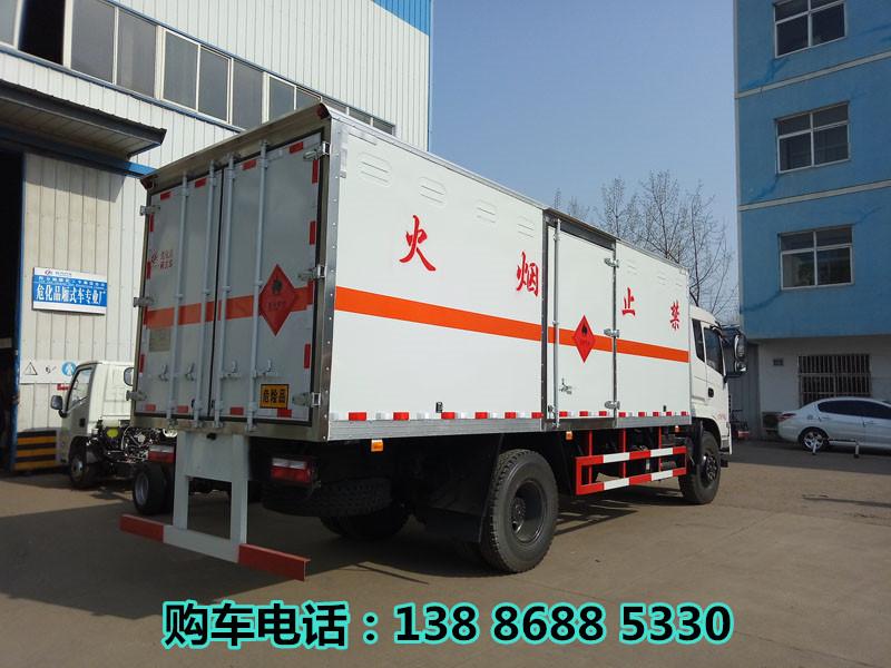 该车适用于运输危险品为危险货物运输车。厢体顶部封闭,不可开启。仅采用底盘子午线轮胎和带ABS的底盘,该车前轮安装盘式制动器,前置排气管,装配限速装置,限速80km/h。整车长度/轴距/后悬对应关系为(mm):8800/5300/2240,8800/4700/2840。安装带有卫星定位功能的行驶记录仪。该车运输具有独立容器包装的介质。运送危险品类项号为2.1;2.2;该车运输的介质为2.1项易燃气体时,车辆采用”易燃气体”标识牌,运输的介质为2.2项非易燃无毒气体时,车辆采用”不燃气体”标识牌。侧防护和后防护装置材料材质为Q235A碳钢,侧防护与箱体底部焊接连接,后防护装置与车架采用焊接连接。后防护截面尺寸(mm):120×50,离地高度为500mm。发动机CY4SK761,D4.5NS6B220,YCS04200-68,B6.2NS6B230对应的油耗值(L/100km)为:26.8,26.6,26.4,26.7。ABS系统生产厂家,型号 :焦作博瑞克控制技术有限公司,J ABS。 该车后轴为采用空气悬架.选装侧开门结构。随底盘选装驾驶室。