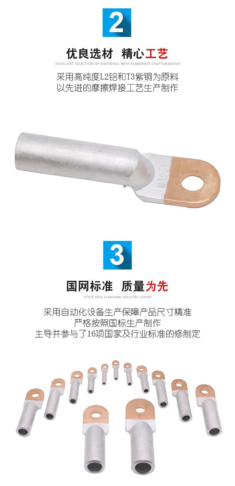 接线端子概述:接线端子做为连接器的一种,是电气行业中的一个重要组件,起着不可替代、不可忽视的作用,因工程技术人员在检修时首先也是从接口检查,也就是端子入手,因此接线端子的设计尤为重要。 产品的设计是集于:产品标准、材料、结构、电镀、认证、模具、及制造工艺的一种综合性设计,端子也不例外。河北双燕电力器材有限公司生产的接线端子符合国家《接线端子执行标准GB-T 14315-2008》DTL系列铜铝接线端子适用于配电装置铝芯电缆与电气设备铜端的过渡连接;DL铝接线端子用于铝芯电缆与电气设备的铝端连接;DT全铜接线端子用于铜芯电缆与电气设备铜端连接。产品采用摩擦焊工艺,具有焊缝强度高,通电性能好,抗电化腐蚀,使用寿命长等特点