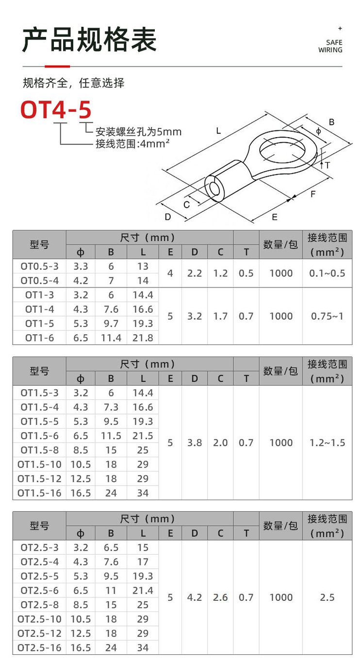 O型线鼻子冷压端头OT6-16\/18\/20\/22\/24黄铜裸端子线耳宇益电气
