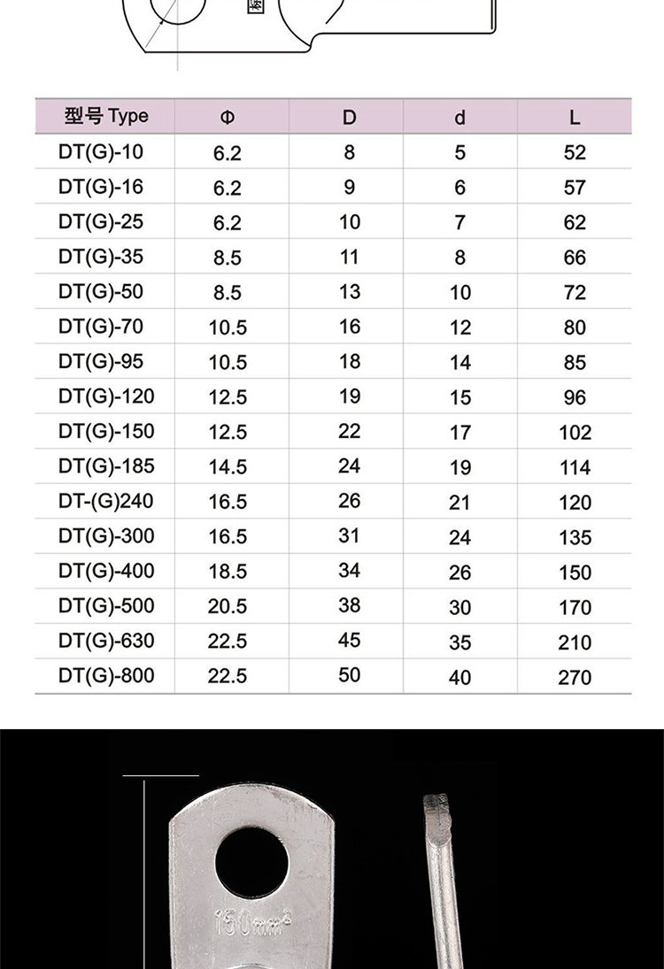 冷压接线端头DTG铜接线端子150mm2紫铜材质管压铜鼻子宇益电气