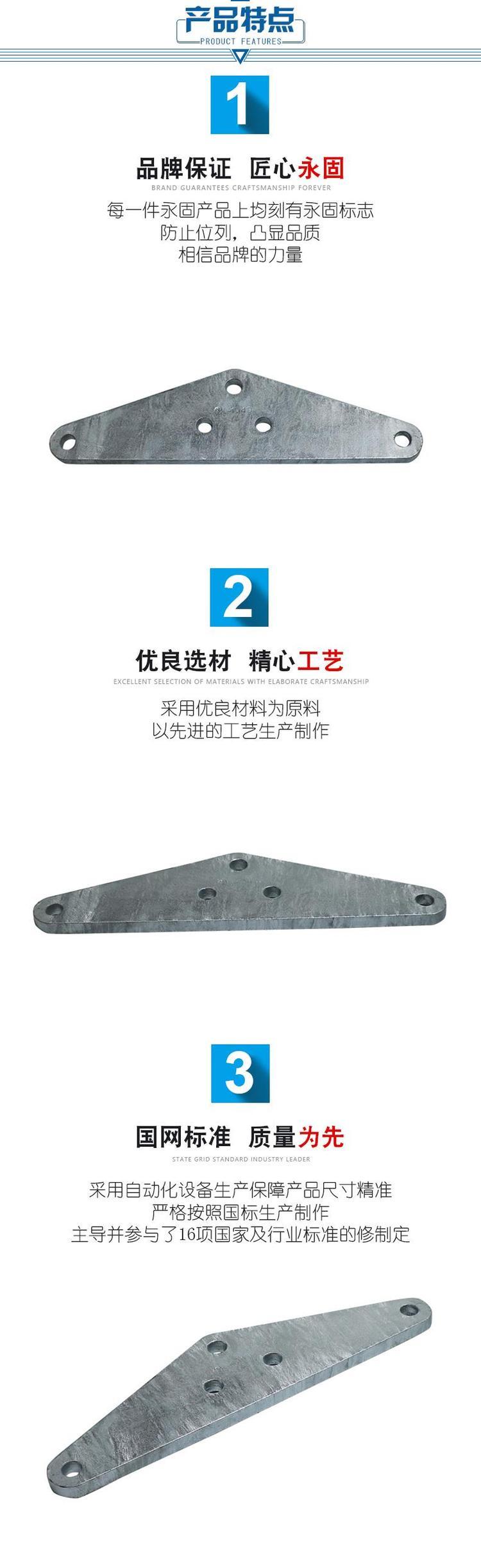是联板的形式有:L型单串绝缘子与二分裂导线联板或双串绝缘子与单根导线联板及三联板;LF型双串绝缘子与二分裂导线联板;LV型双拉线并联联板;LS型组合母线用双联板;U型 装均压环用联板。联板型号中字母及数字的含义为:L,联板;F,方形;V,V形;S,双联;J,装均压环;数 字,前两位表示破坏负荷(X104N),后两位表示孔距(cm)。它适用于架空电力线路和变电站组装多 串悬式绝缘子串,分裂导线与绝缘子串的固定及多根拉线并联。