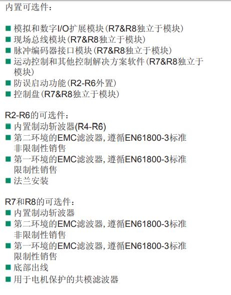 R2-R6模块设计为柜体壁挂式安装,功率从0.55kW 至200kW,电压范围从230V到690V。标准配置下模 块的防护等级为IP20。 法兰安装作为可选件,它使控制回路和散热器部分气 流分离,并能提高传动单元的散热器散热效果。模块 的散热器部分具有IP55的防护等级。防误启功能(遵 循EN954-1,第3类)也是可选件。