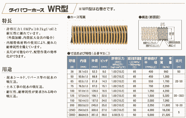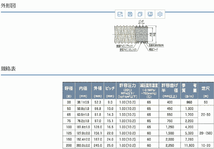 高許容圧力1.0Mpa{10.2kgf/cm2}の耐圧を有しています。(φ300は、0.50Mpa)内層に材料を使用し優れた耐摩耗性を備えています。