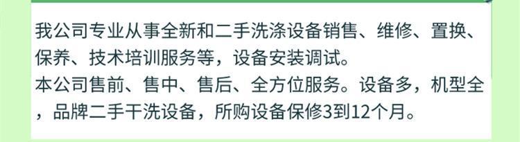 本公司所有二手洗涤设备价格合理,服务周到,买的放心,用的开心,开干洗店,水洗厂买二手洗涤设备划算。售后保修一年,终生维修,免费送货上门,安装调试,免费教洗衣技术二洗涤设备公司对广大新老客户的长期承诺,本公司面向全国长期售收二手干洗设备,二手干洗机,售后保障,保修3-5个月,终身维修,首次免费上门安装调试,免费教技术!