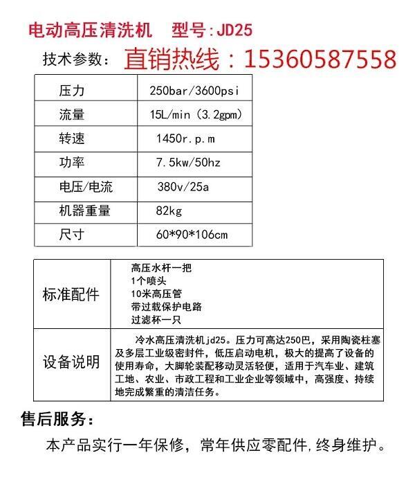 君道JD25高压清洗机,压力可达250公斤,采用陶瓷柱塞及多层工业级密封件,低压启动电机,极大的提高了设备的使用寿命,大脚轮装配移动灵活轻便,适用于汽车业、建筑工地、农业、市政工程和工业企业等领域中,高强度、持续的完成繁重的清洁任务。