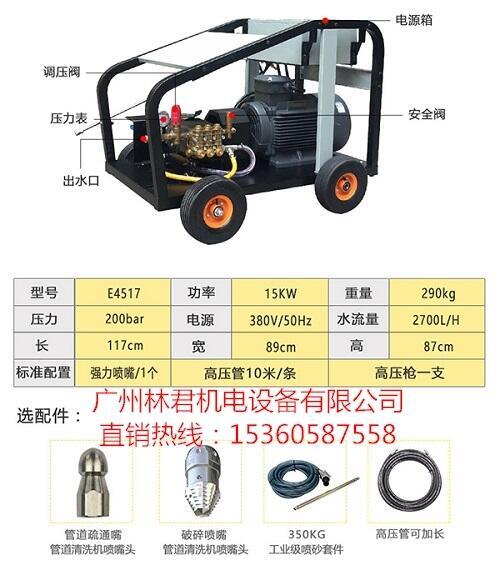 君道E4517管道疏通清洗机,电机启动,380V电压,水流量45升每分钟,压力可达200公斤,专为管道清洗、疏通以及各类高压清洗机作业设计,可以疏通管道直径为:10-500毫米,疏通长度可达60米。因为需要方便用电的地方,E4517管道疏通清洗机比较适合居民楼、宾馆、饭馆、物业小区等下水道疏通清洗作业。