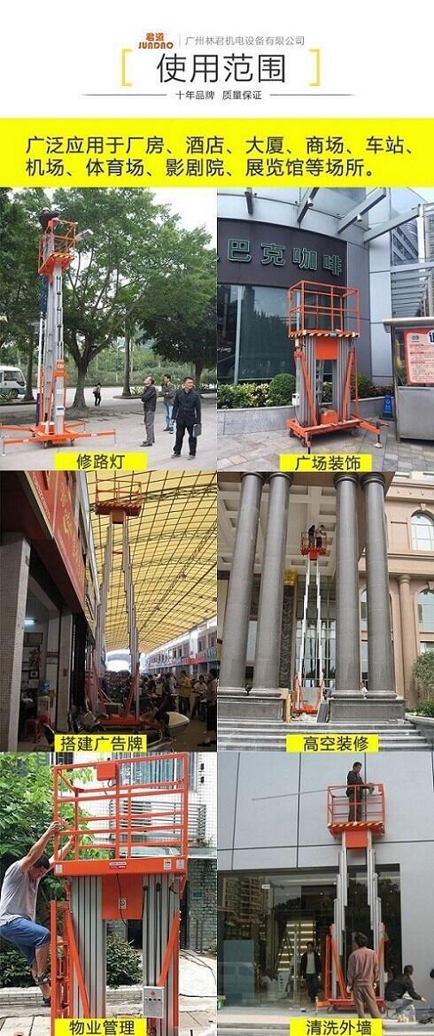 升降平台起升机构由驱动机构,钢丝绳卷绕系统,吊具和安全保护装置等组成。驱动机构包括电动机,铝合金升降机,联轴器,制动器,卷筒,支承等部件。安全保护装置除了高,低速级配备制动器外,还包括有各种行程限位开关,铝合金升降机价格,超速开关以及超负荷保护装置等。