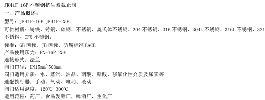 JK41F-16P不锈钢抗生素截止阀