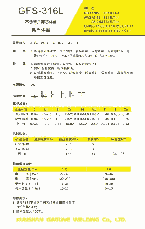 说明:GES-316L主要成分是低C-18Cr-12Ni-2Mo,可采用交直流电源,全位置焊接。