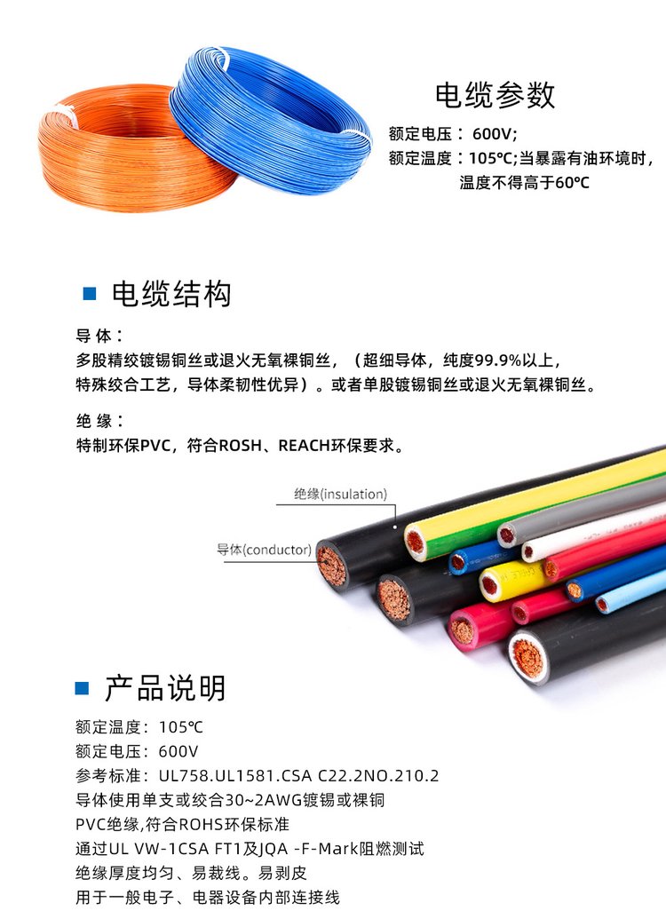 爱德森UL101514awg镀锡铜耐温105度600v美标规格齐全PVC电子线