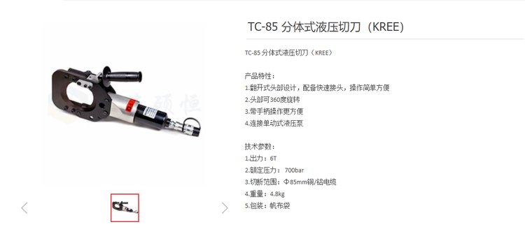 TC-85 分体式液压切刀(KREE)Φ85mm铜/铝电缆软质剪刀 品牌 | 开力KREE | ||