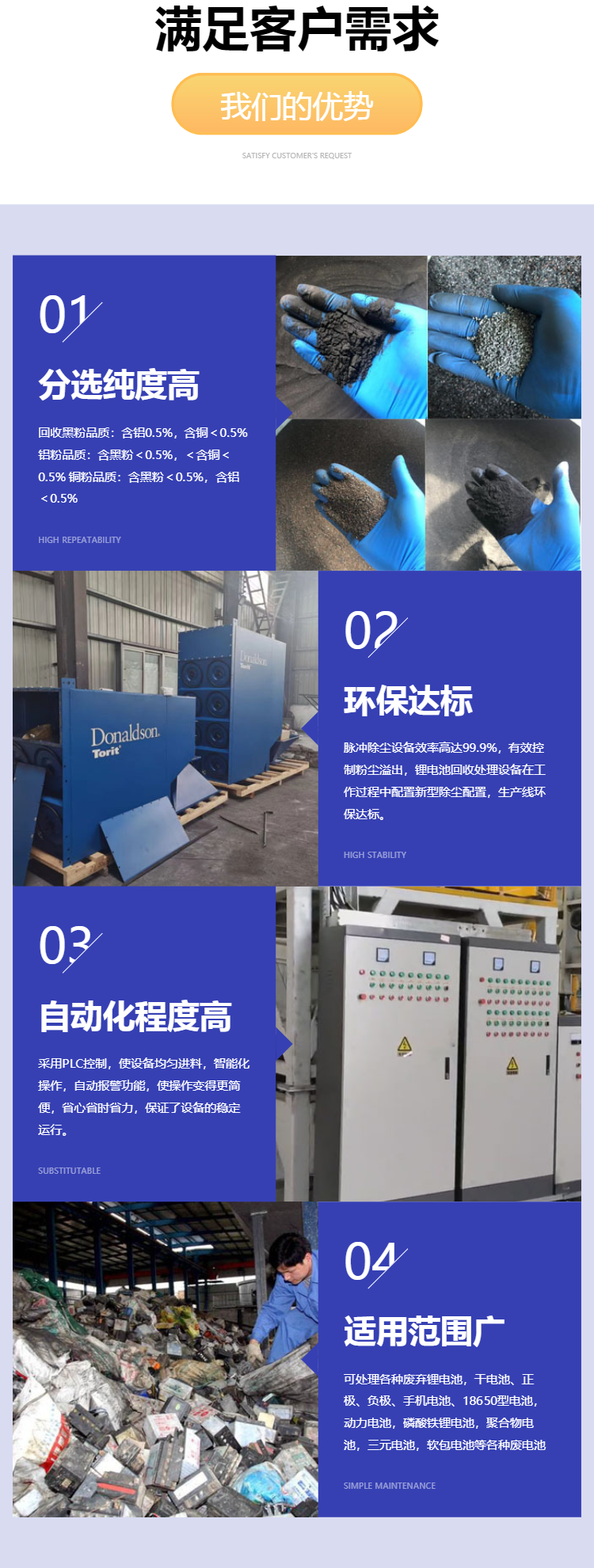 适应范围 | 各种废旧汽车磷酸铁锂电池、三元锂电池、软包电池 | ||