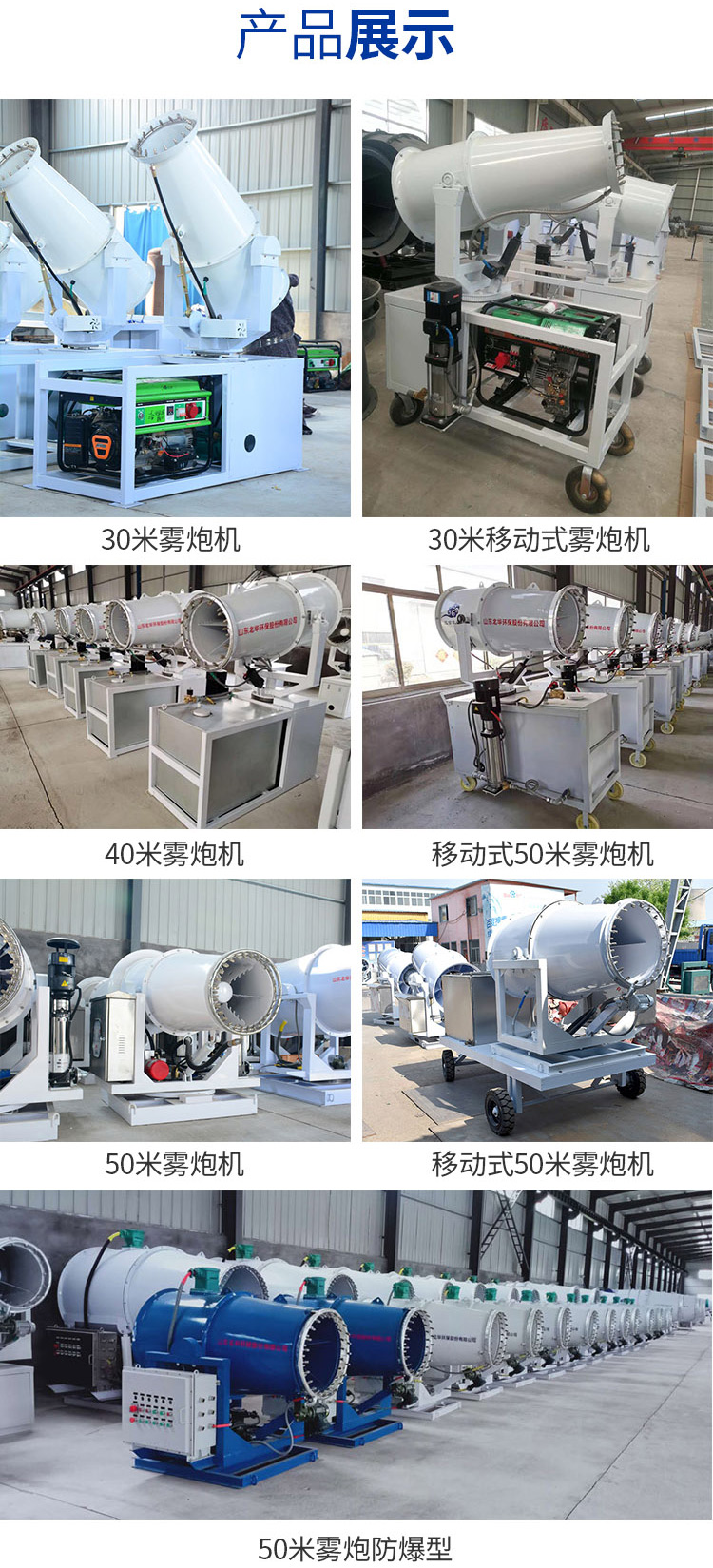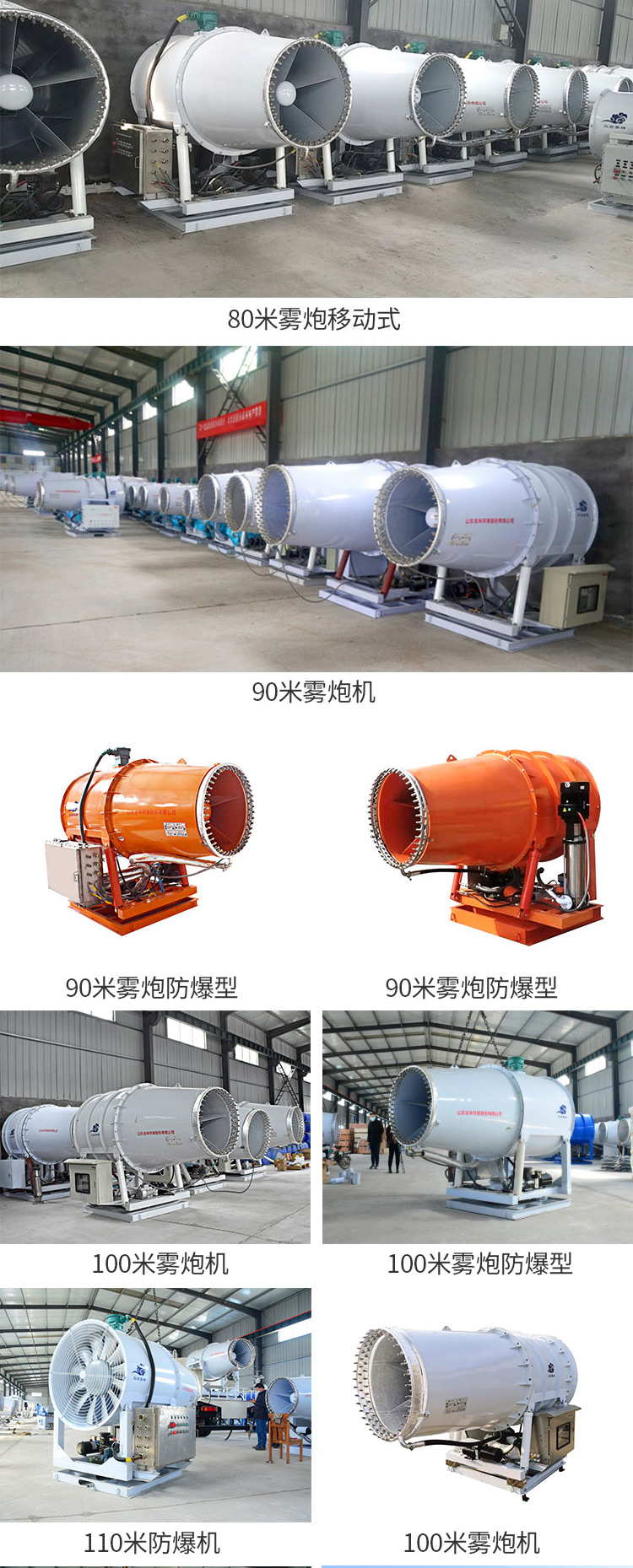 雾粒度(μm)(可调节) | 20~150(可定制超细款)(可定制干雾雾炮)(可定制双流体雾炮) | ||