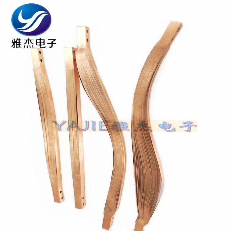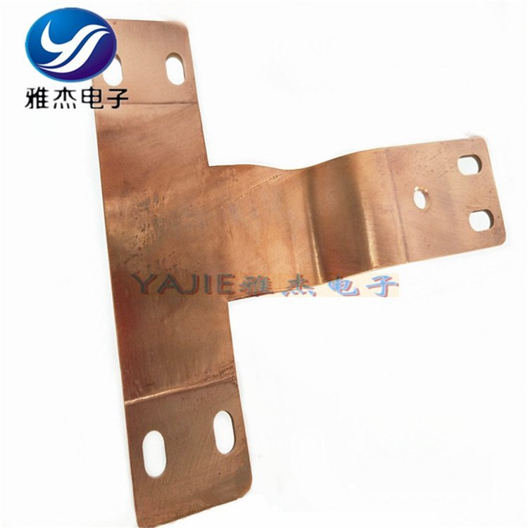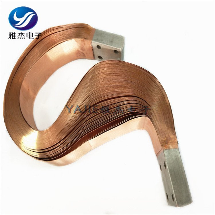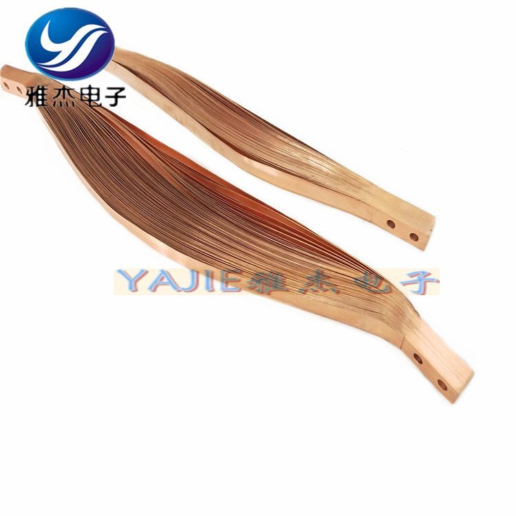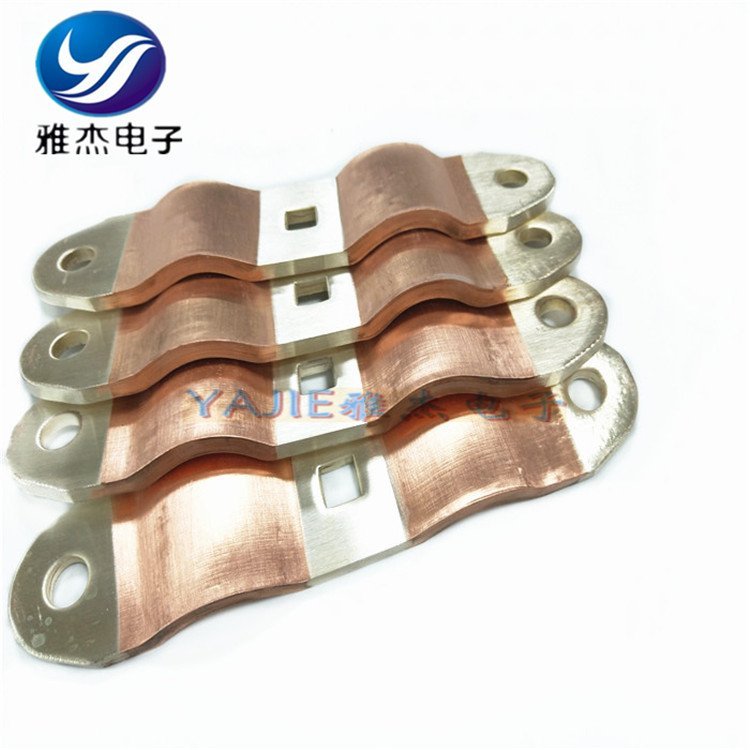 东莞市雅杰电子材料有限公司铜母线伸缩节经氩弧焊工艺进行熔压焊接,两端硬铜排,中间软铜片。整体或表面可镀银、镀锡处理。