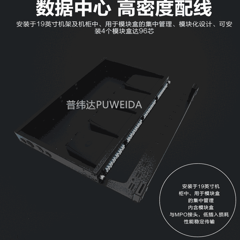 96芯模块式光纤分线盒 ( 由两套A 型48 芯MPO-LC 模块插 盒和1UA 型光纤分线盒盒体套件组成) |