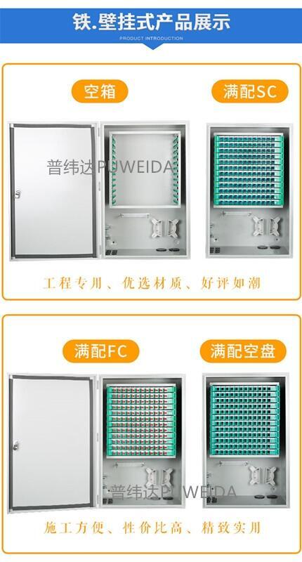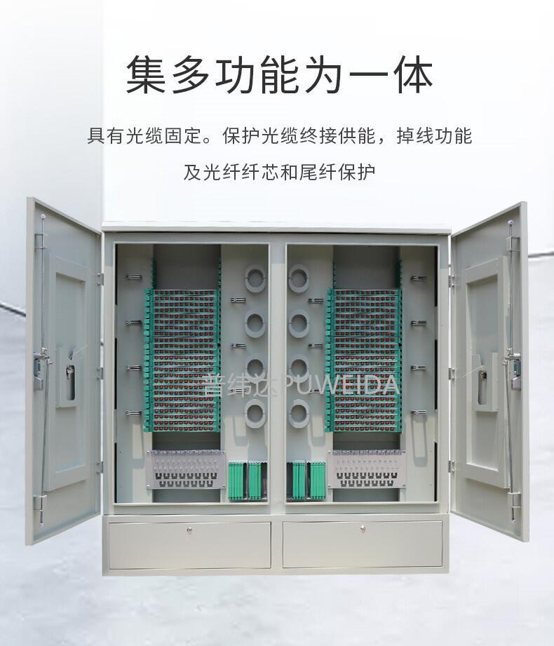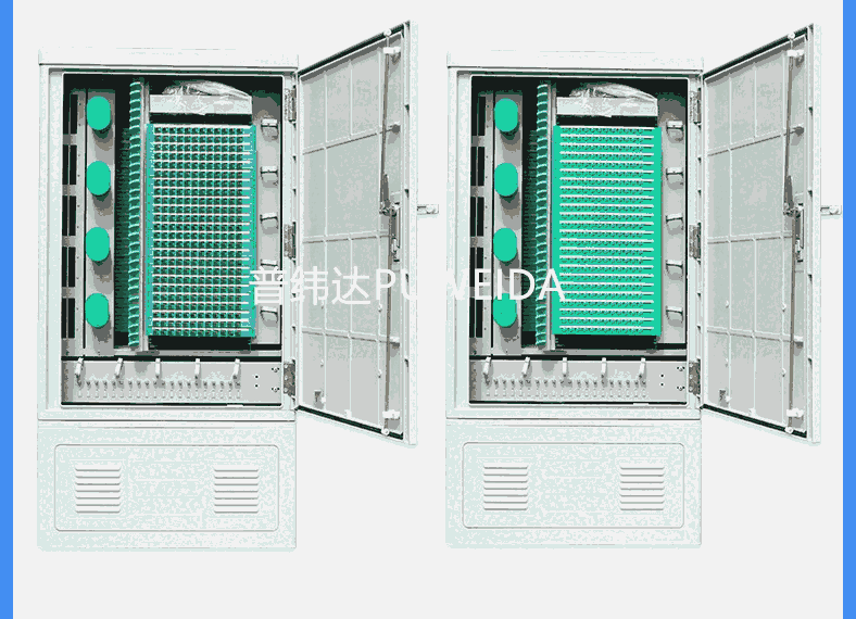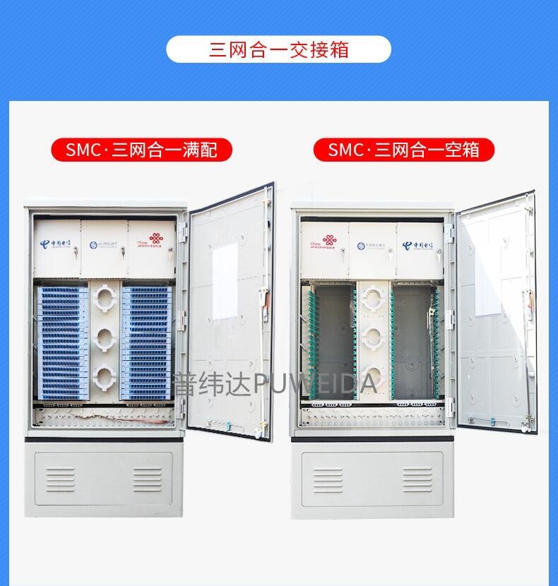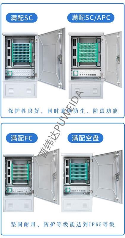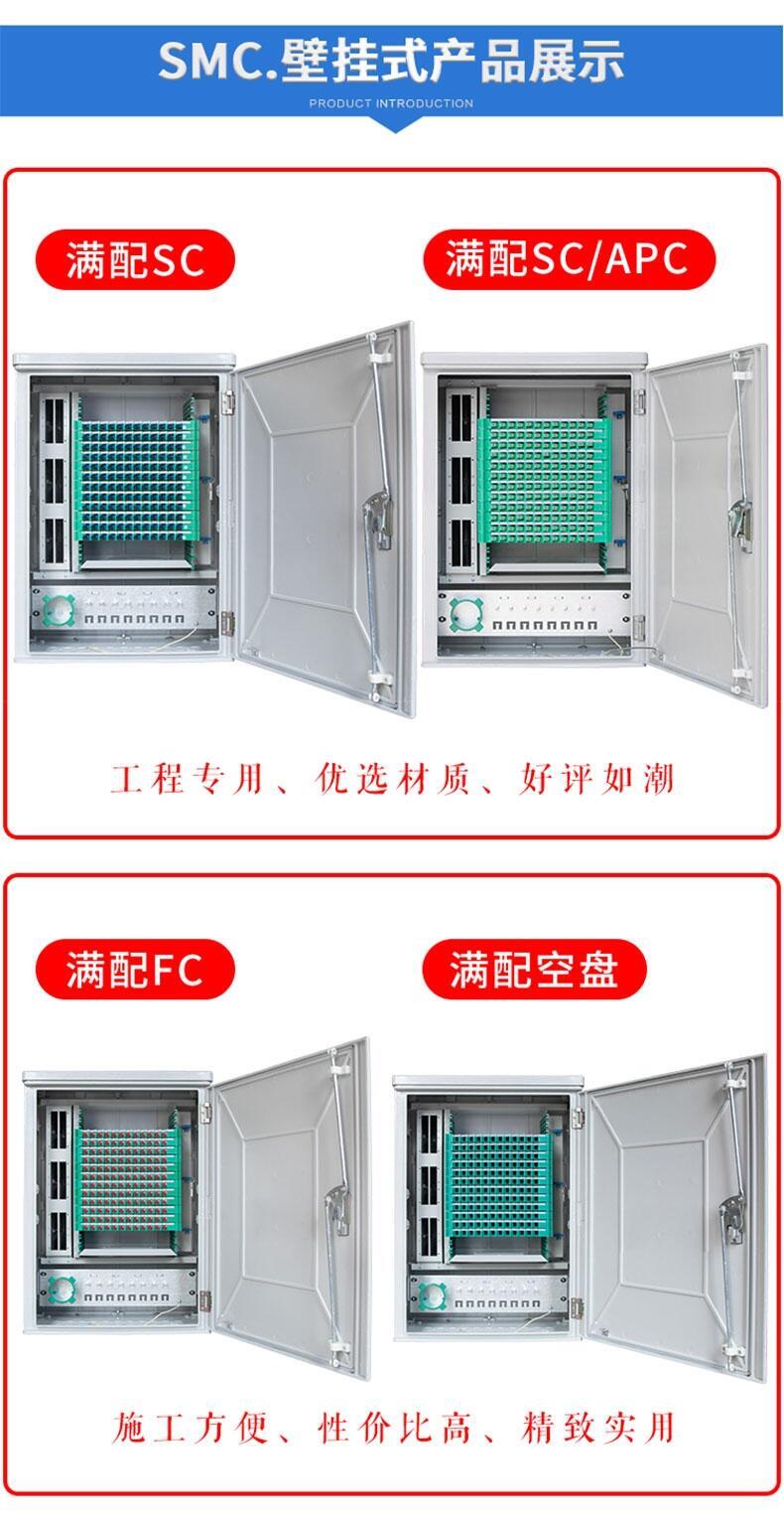 2.容量:72芯96芯144芯288芯360芯432芯576芯720芯864芯1152芯几种。箱体材质常见的为SMC 箱体。(SMC 是Sheetmolding Compound 的缩写,即片状模塑料。主要原料由SMC 专用纱、不饱和树脂、低收缩添加剂,填料及各种助剂组成。SMC 具有优越的电气性能,耐腐蚀性能,质轻及工程设计容易、灵活等优点,其机械性能可以与部分金属材料相媲美,因而广泛应用于运输车辆、建筑、电子/电气等行业中。