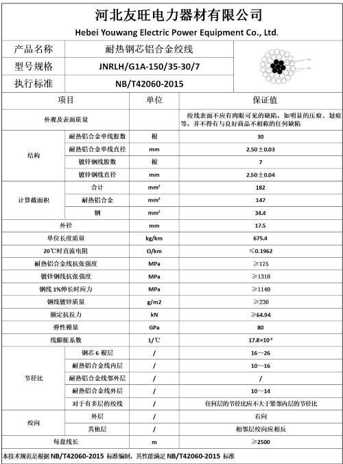 二、产品执行标准: NB/T42060-2015《钢芯耐热铝合金架空导线》