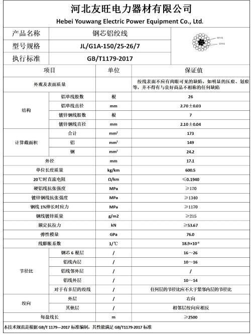 二、 产品执行标准:GB/T1179-2017 《圆线同心绞架空导线》;