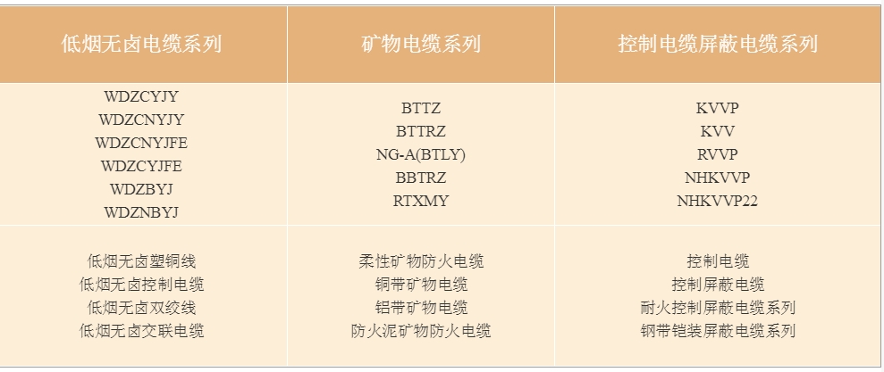 电力电缆主要有:交联电力电缆、铠装交联电力电缆:YJV(铜芯电缆)、YJV22(铠装铜芯电缆)、YJLV(铝电缆)、YJLV22(铠装铝电缆),电力电缆:VLV、VLV22、VV、VV22,控制电缆、铠装控制电缆:KVV、KVV22.控制屏蔽电缆、控制屏蔽铠装电缆:KVVP、KVVP22.低烟无卤电力电缆、低烟无卤阻燃耐火电力电缆等:WDZ-YJV、WDZBN-YJV、WDZBN-YJV22、柔性矿物电缆、YTTW/BTTRZ、BBTRZ、NG-A(BTLY)、橡套线、潜水泵线JHS/YCW/YC,硅橡胶电缆、计算机电缆等