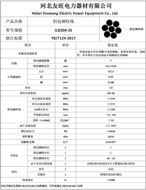 产品执行标准:YB/T124-2017《铝包钢钢绞线》;