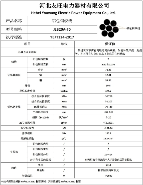 二、 产品执行标准:YB/T124-2017《铝包钢钢绞线》;